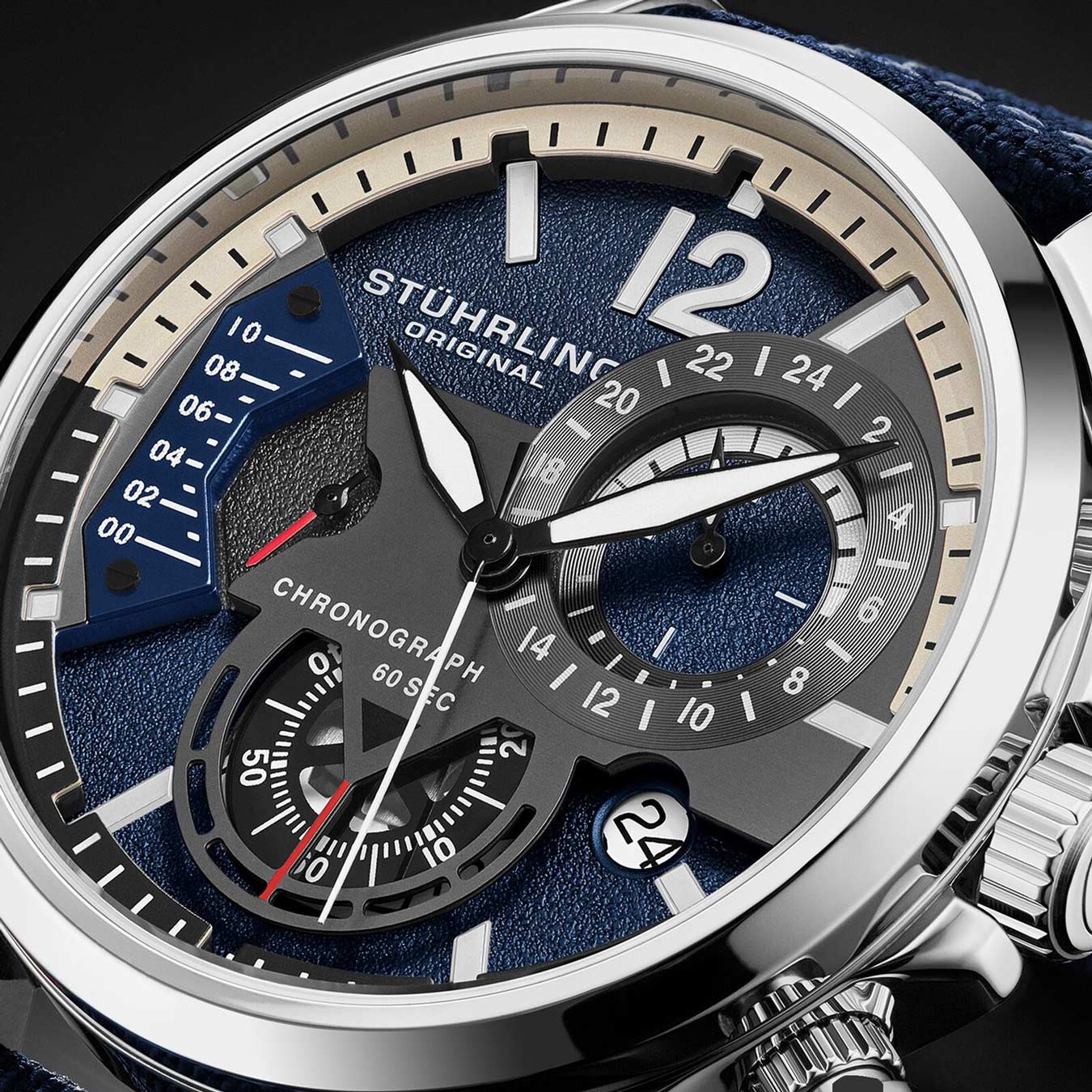 Дизайн аксессуара повторяет ключевые особенности элементов приборной панели прославленного военного самолета Hunters. Cordura. Часы-хронограф с секундомером до 10 мин. Ретроградный указатель минут хронографа. 12-ти и 24-х часовой формат времени. Накладные метки в виде штрихов, точек и арабской цифры 12. Окошко даты находится в положении 4 часа. Завинчивающаяся задняя крышка. Рифленая заводная головка с защитой. Ремешок из кожи и ткани кордура с классической застежкой.
