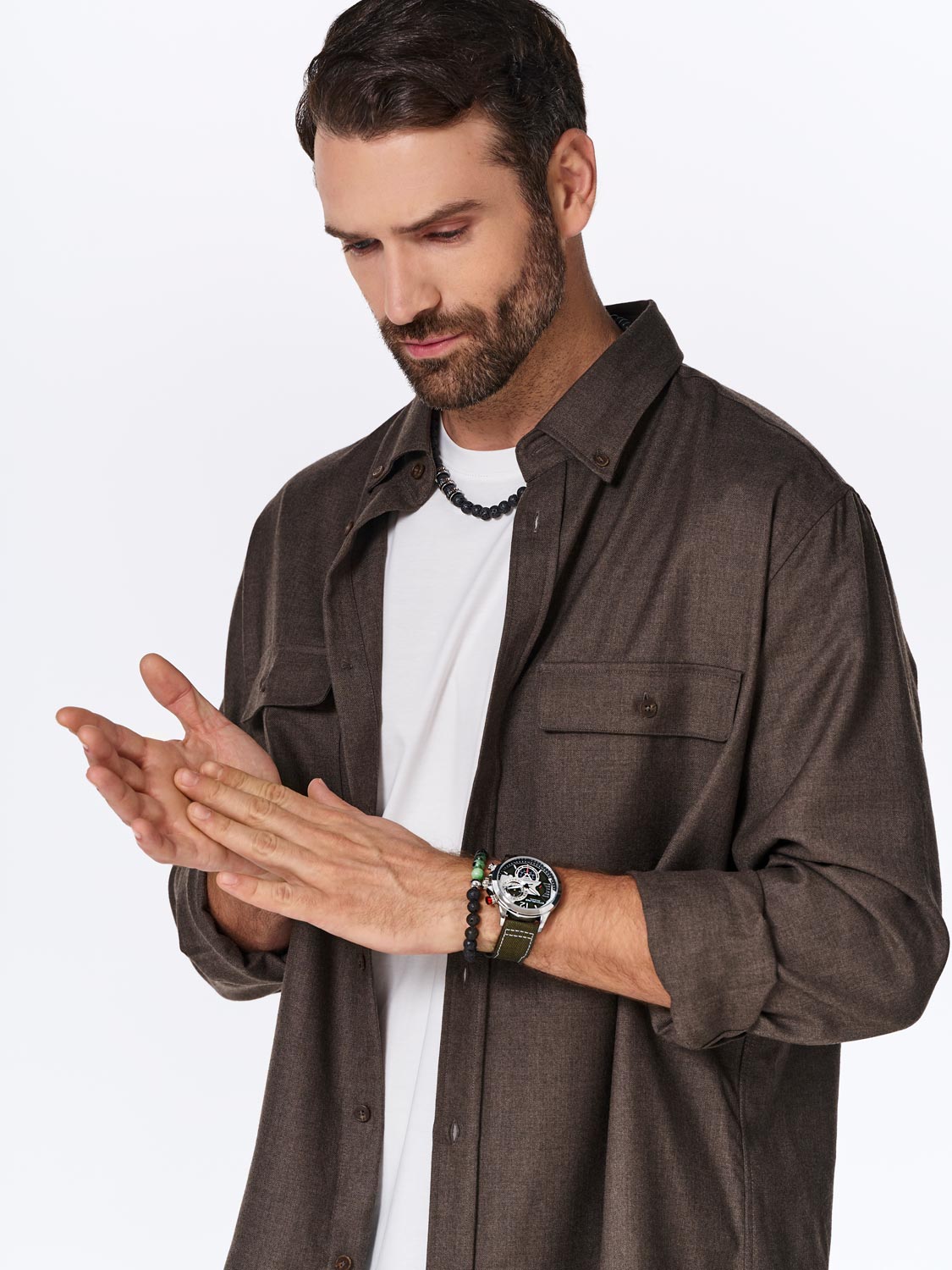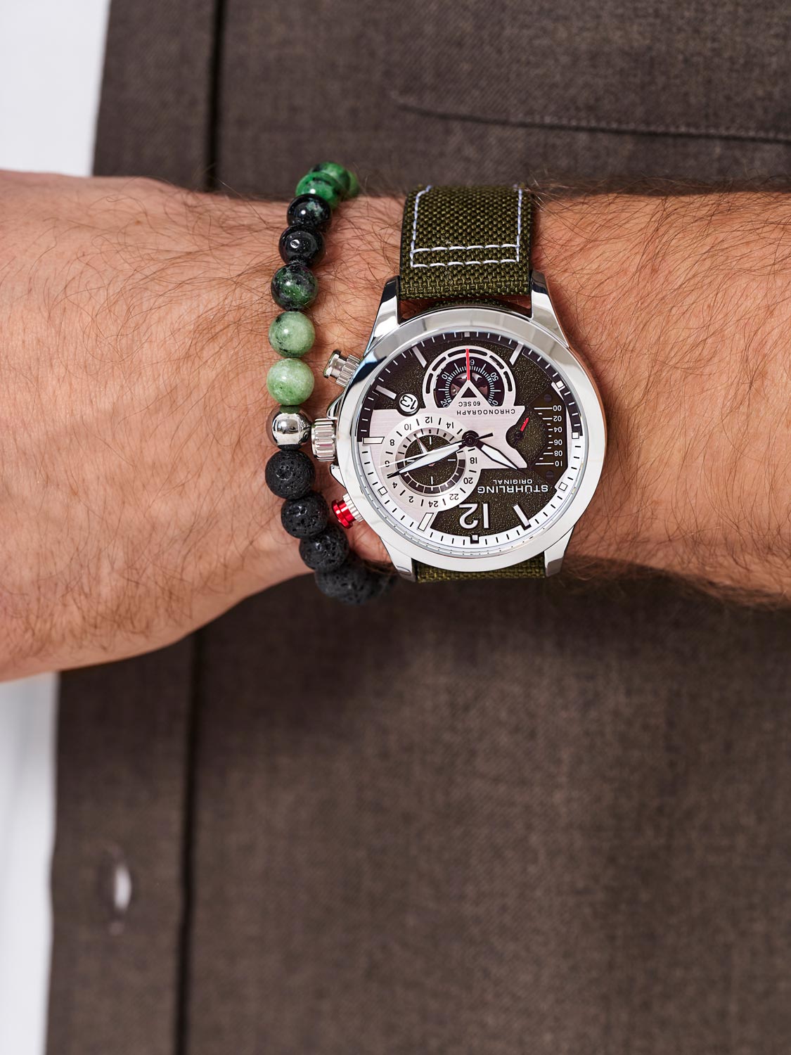Дизайн аксессуара повторяет ключевые особенности элементов приборной панели прославленного военного самолета Hunters. Cordura. Часы-хронограф с секундомером до 10 мин. Ретроградный указатель минут хронографа. 12-ти и 24-х часовой формат времени. Накладные метки в виде штрихов, точек и арабской цифры 12. Окошко даты находится в положении 4 часа. Завинчивающаяся задняя крышка. Рифленая заводная головка с защитой. Ремешок из кожи и ткани кордура с классической застежкой.