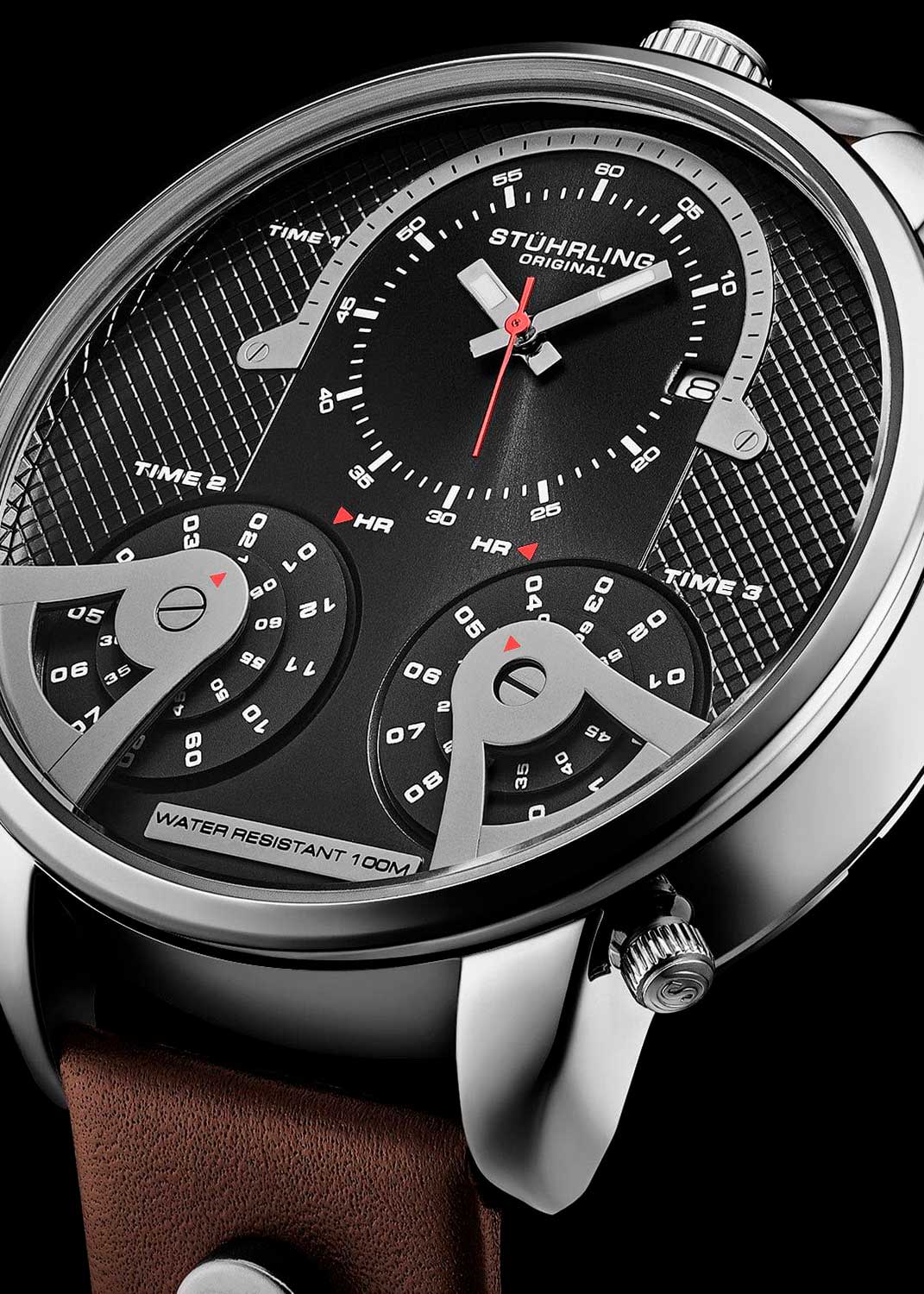Мужские наручные кварцевые часы TerraTime Triple-Time. Круглый корпус с полированной отделкой. Текстурированный циферблат с центральной частью выполненной по технологии Sunray (солнечные лучи). Три часовых пояса. Два циферблата для отображения времени в нескольких часовых поясах вынесены отдельно. Метки в виде штрихов. Прямоугольные стрелки в стиле Baton.