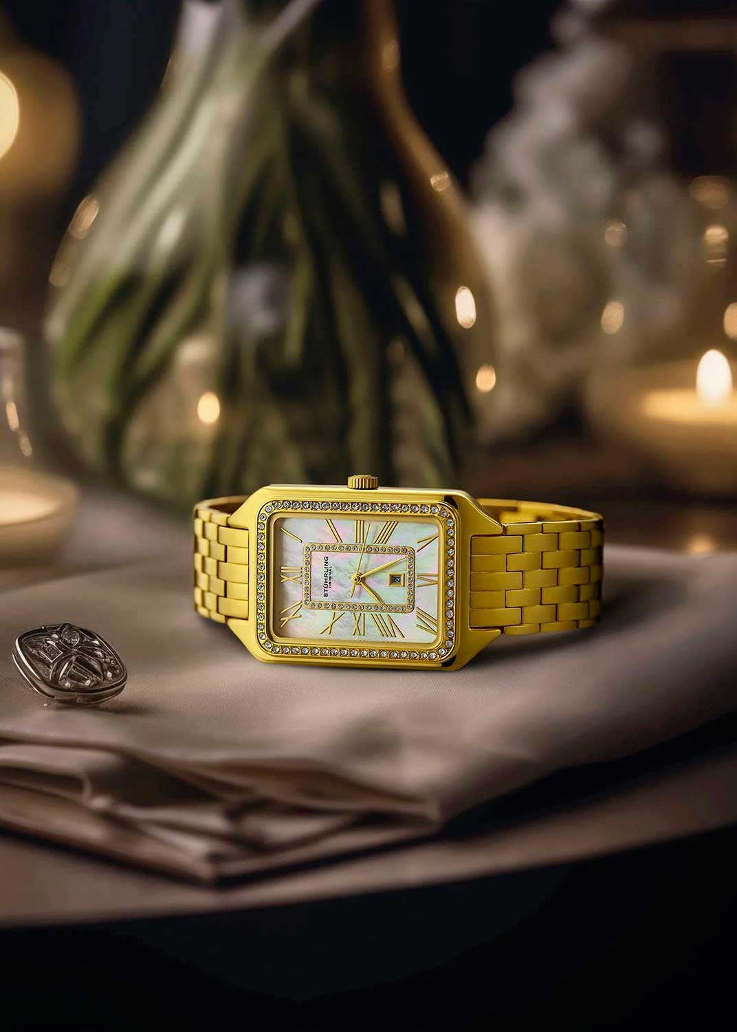 Кварцевые наручные женские часы. Прямоугольный полированный корпус инкрустирован кристаллами. Перламутровый циферблат с центральной частью, выделенной кристаллами, украшен логотипом бренда.