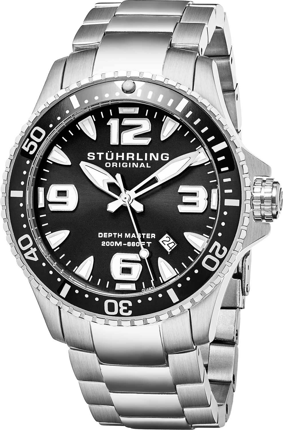 Regatta. Циферблат выполнен по технологии Sunray (солнечные лучи). Метки в виде штрихов и арабских цифр. Окошко даты находится в положении между 4 и 5 часами. Безель вращается в одном направлении. Завинчивающаяся заводная головка с защитой. Завинчивающаяся задняя крышка украшена гравировкой Stuhrling. Браслет с раскладывающейся застежкой. Застежка с системой блокировки.