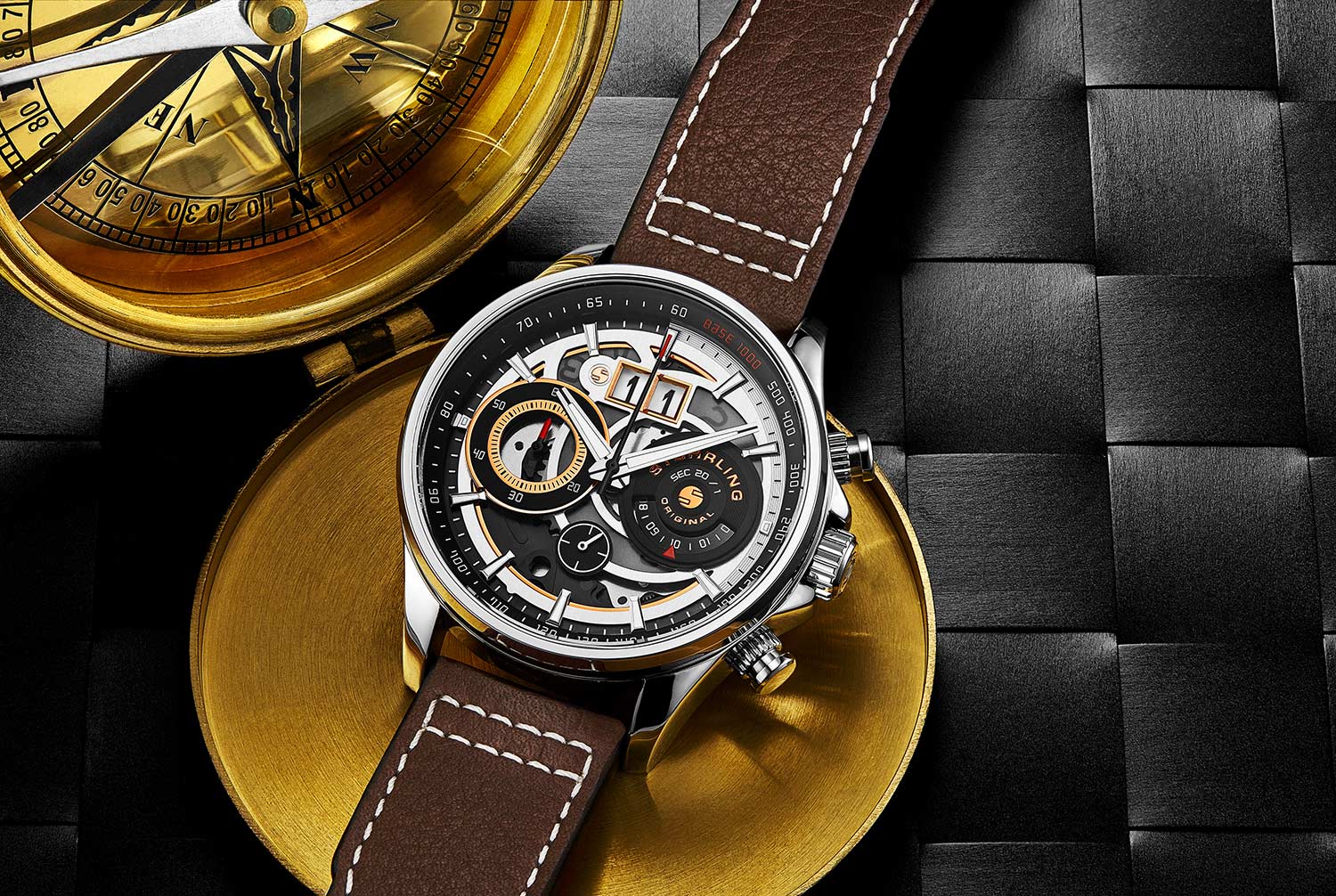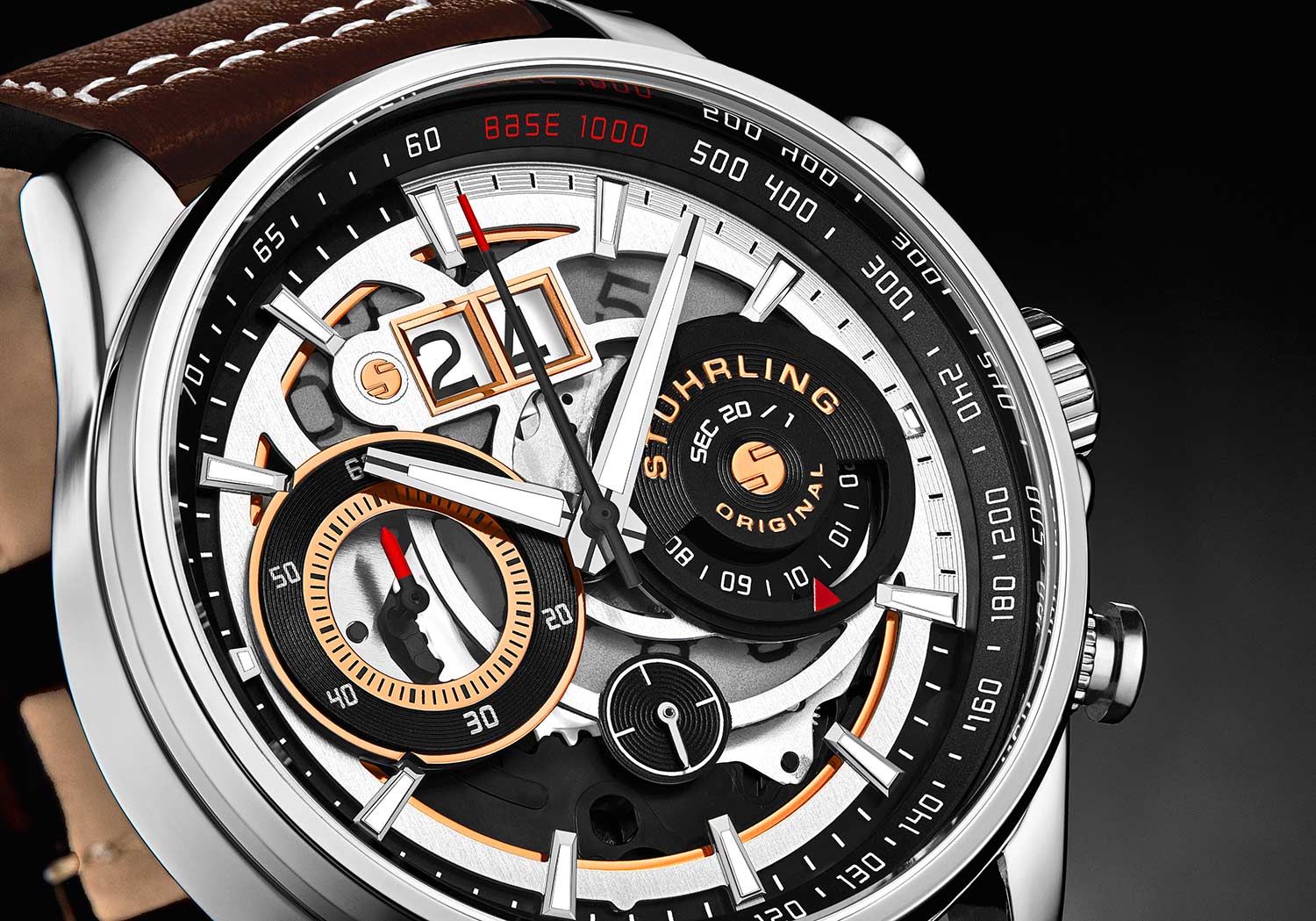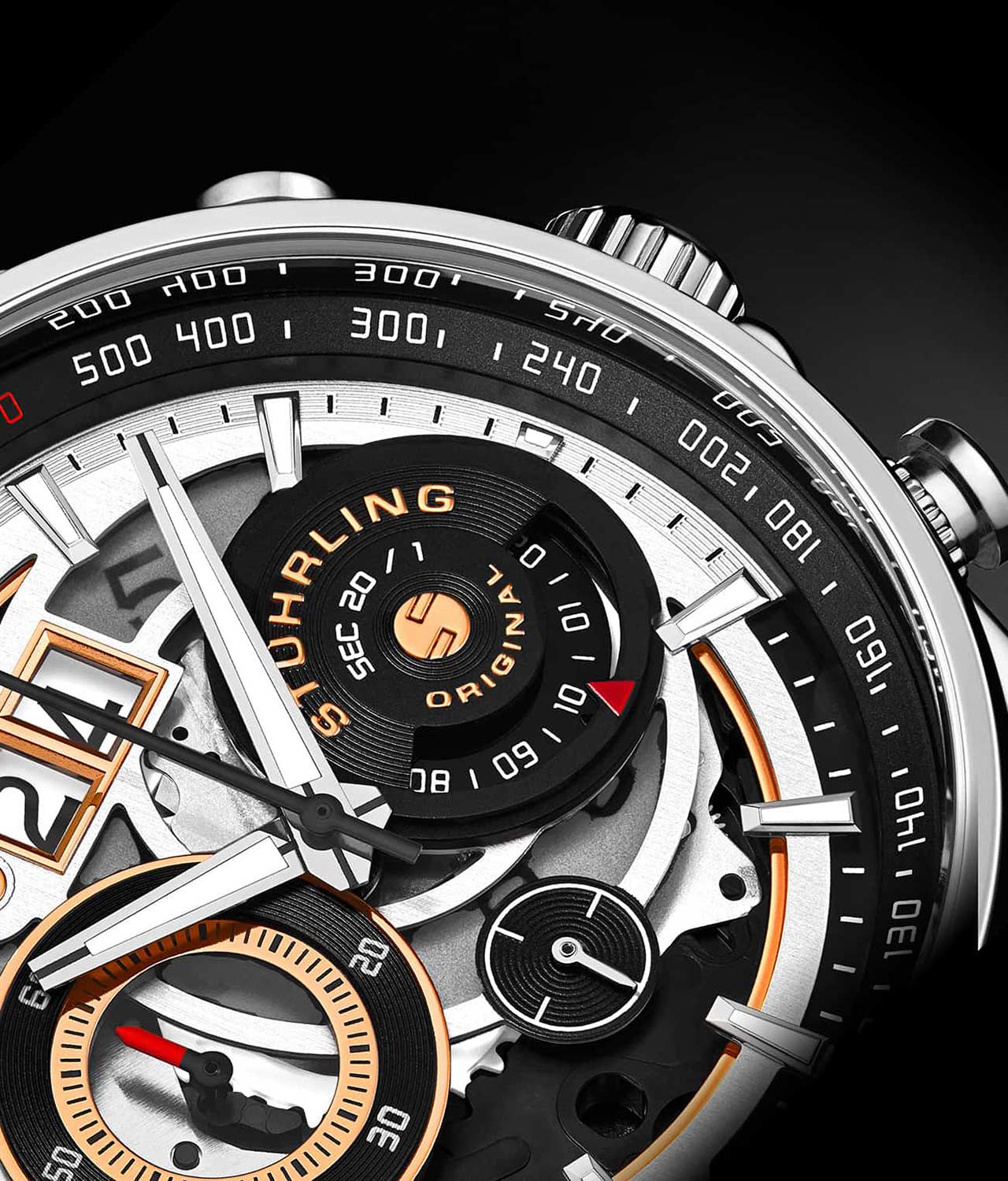 Массивные функциональные часы подчеркнут вашу активную жизненную позицию. Ace Aviator. Скелетонизированные часы-хронограф с секундомером и тахиметром. Секундомер с точностью 1/20сек. Метки в виде штрихов. Заводная головка с защитой. Ремешок с классической застежкой.