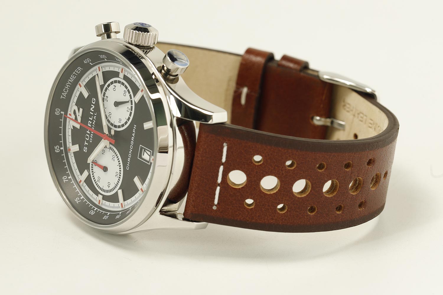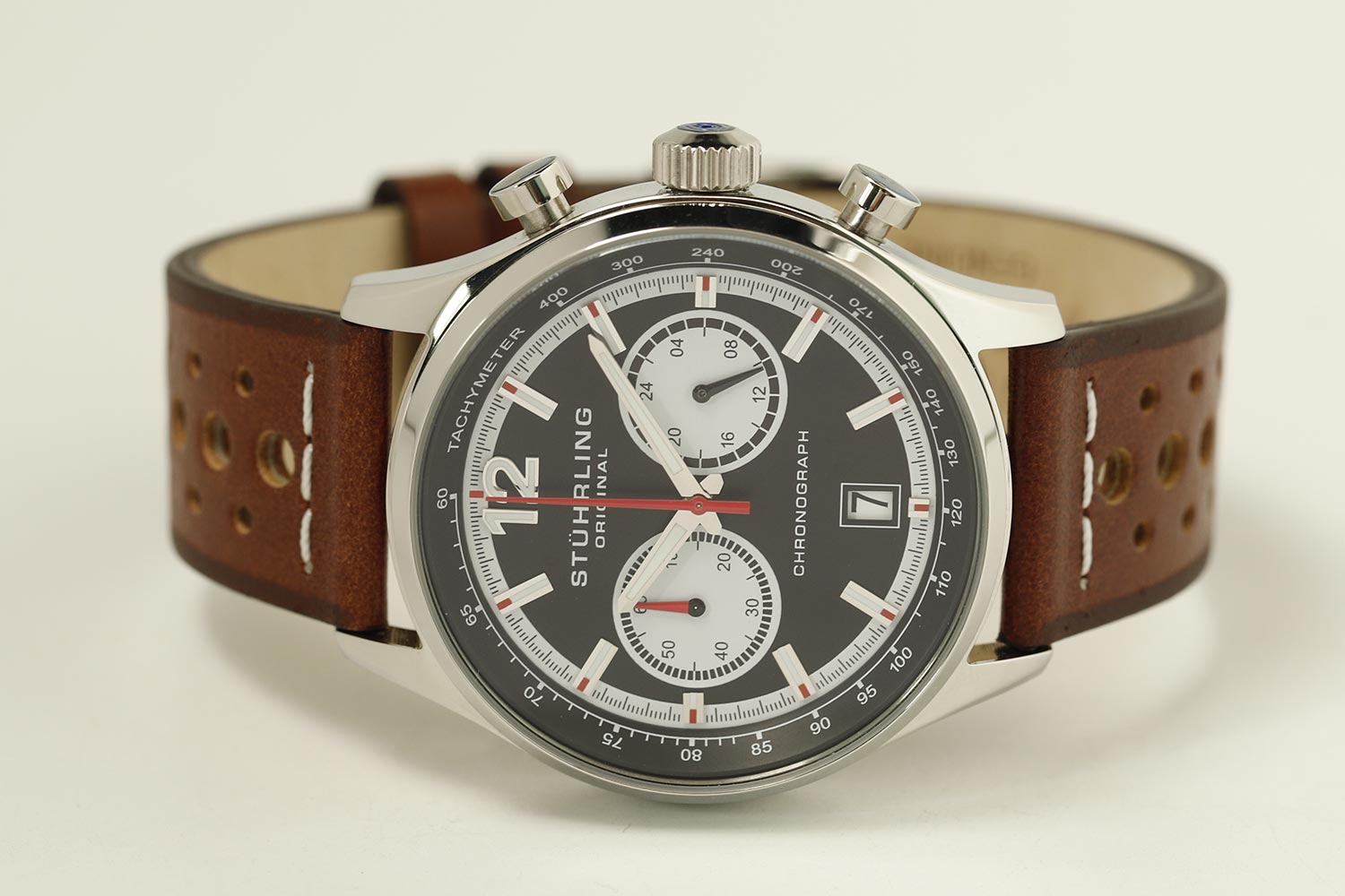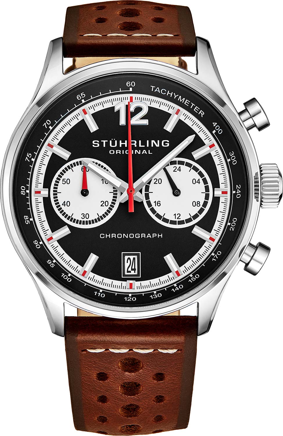 Хронограф от компании Stuhrling станет незабываемым подарком для поклонников стильных часов. Monaco. Часы-хронограф с секундомером и тахиметром. 12-ти и 24-х часовой формат времени. Накладные метки в виде штрихов. Окошко даты находится в положении 6 часов. Завинчивающаяся задняя крышка. Перфорированный ремешок с классической застежкой.
