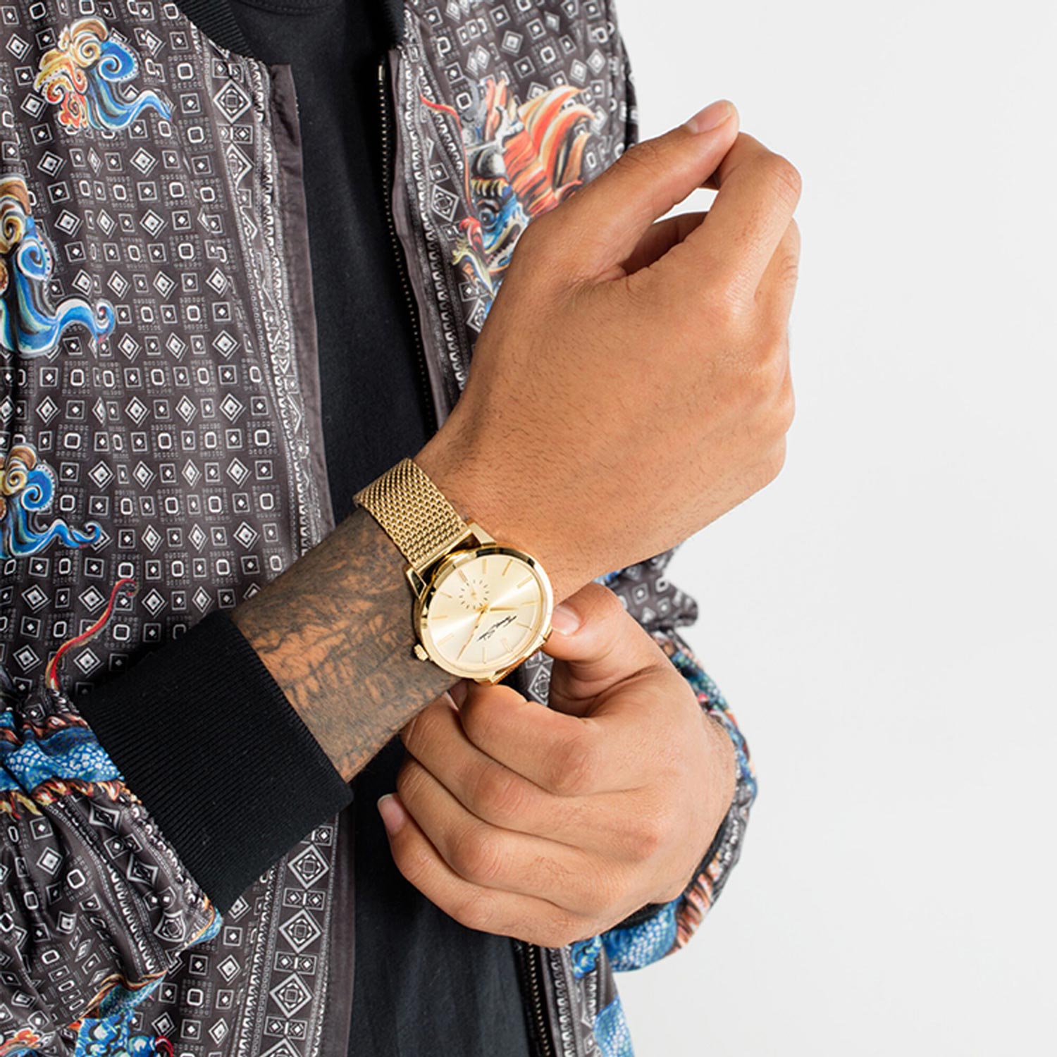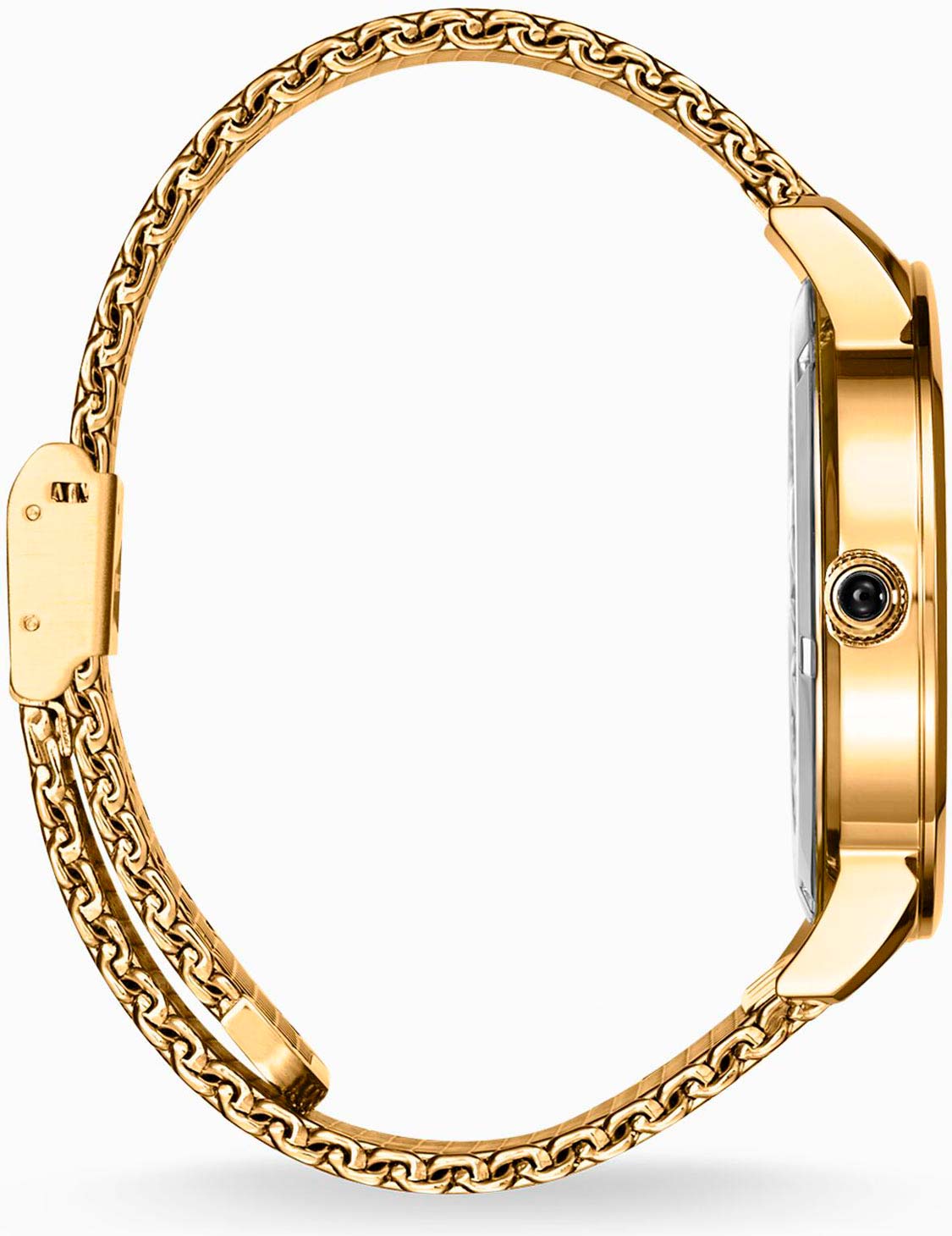 Эта выразительная модель в цвете желтого золота станет ключевым элементом стильного образа. Мужские часы с круглым стальным корпусом Rebel Spirit Mesh Gold. Циферблат выполнен по технологии Sunray (солнечные лучи). Секундная стрелка вынесена отдельный циферблат. Рифленая заводная головка украшена ониксом в форме кабошона. Браслет миланского плетения.