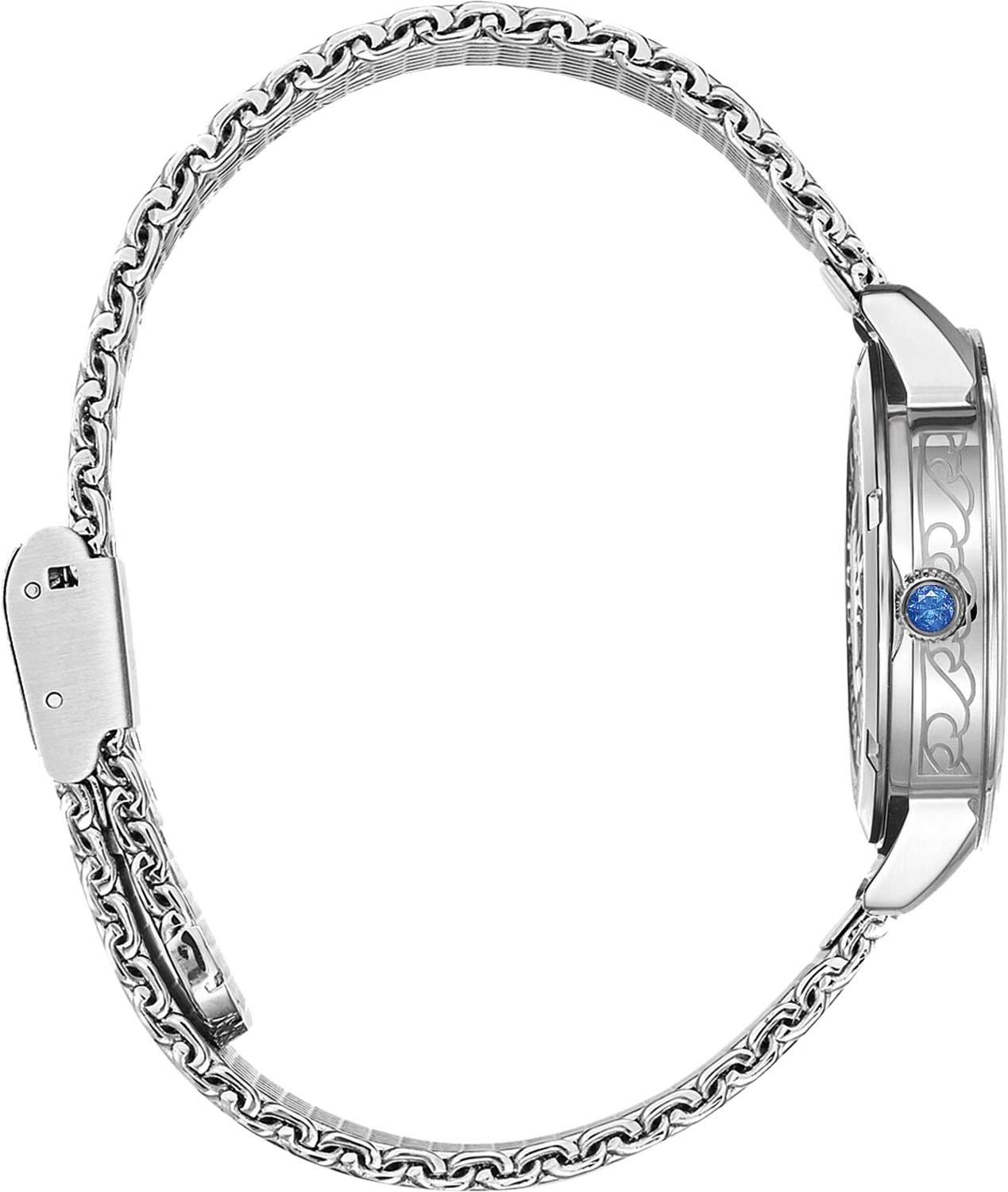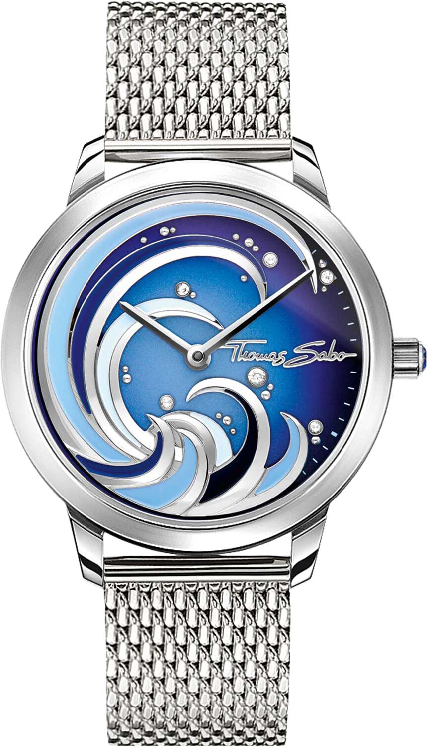 Морские мотивы и яркие краски добавляют этим часам уникальность и безупречный стиль. Аксессуар для настоящих модниц. Женские часы с круглым стальным корпусом. Циферблат с рисунком океанских волн украшен кристаллами и логотипом бренда. Рифленая заводная головка. Завинчивающаяся задняя крышка с гравировкой. Браслет миланского плетения.