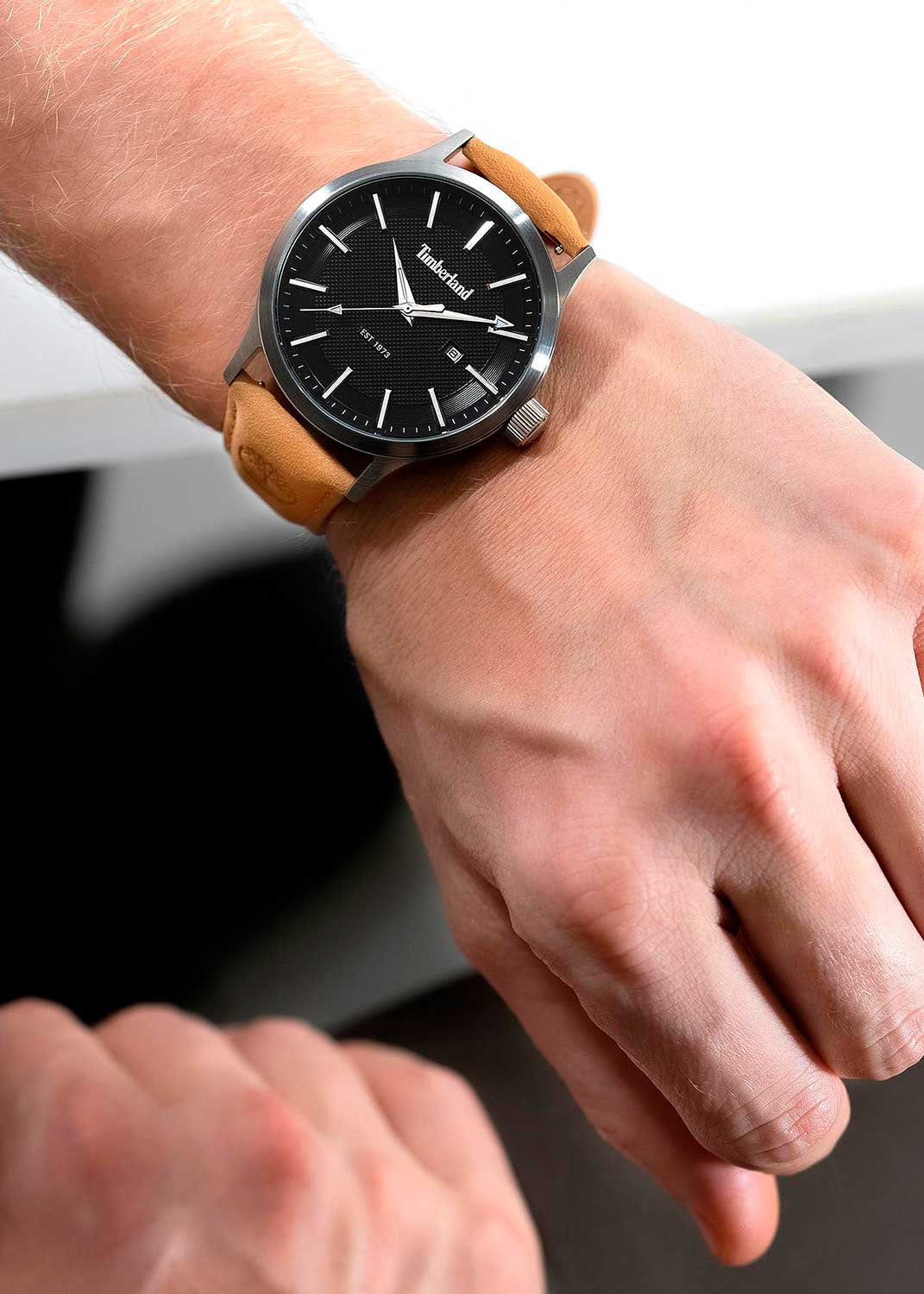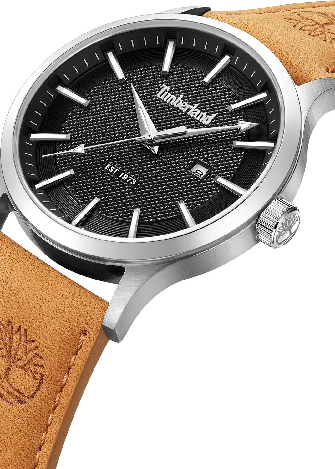 Окошко даты находится в положении 3 часа. Рифленая заводная головка и завинчивающаяся задняя крышка украшены фирменным логотипом компании Timberland. Кожаный ремешок с классической застежкой и системой быстрой замены.