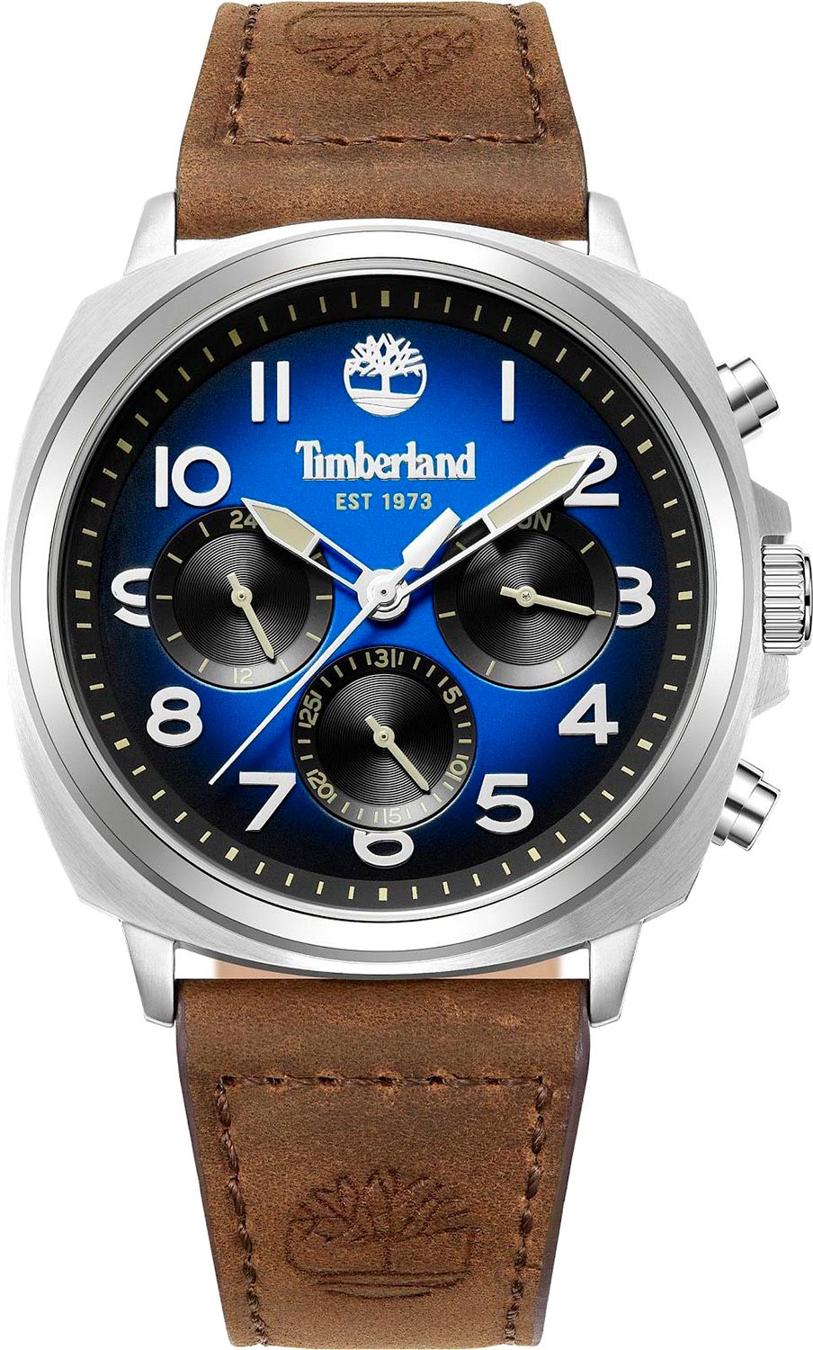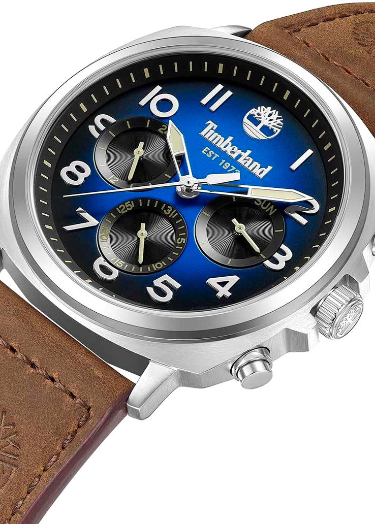 12-ти и 24-х часовой формат времени. Дата и день недели вынесены на отдельные циферблаты. Рифленая заводная головка с защитой. Завинчивающаяся задняя крышка. Заводная головка и задняя крышка украшены фирменным логотипом компании Timberland. Кожаный ремешок с классической застежкой и системой быстрой замены.