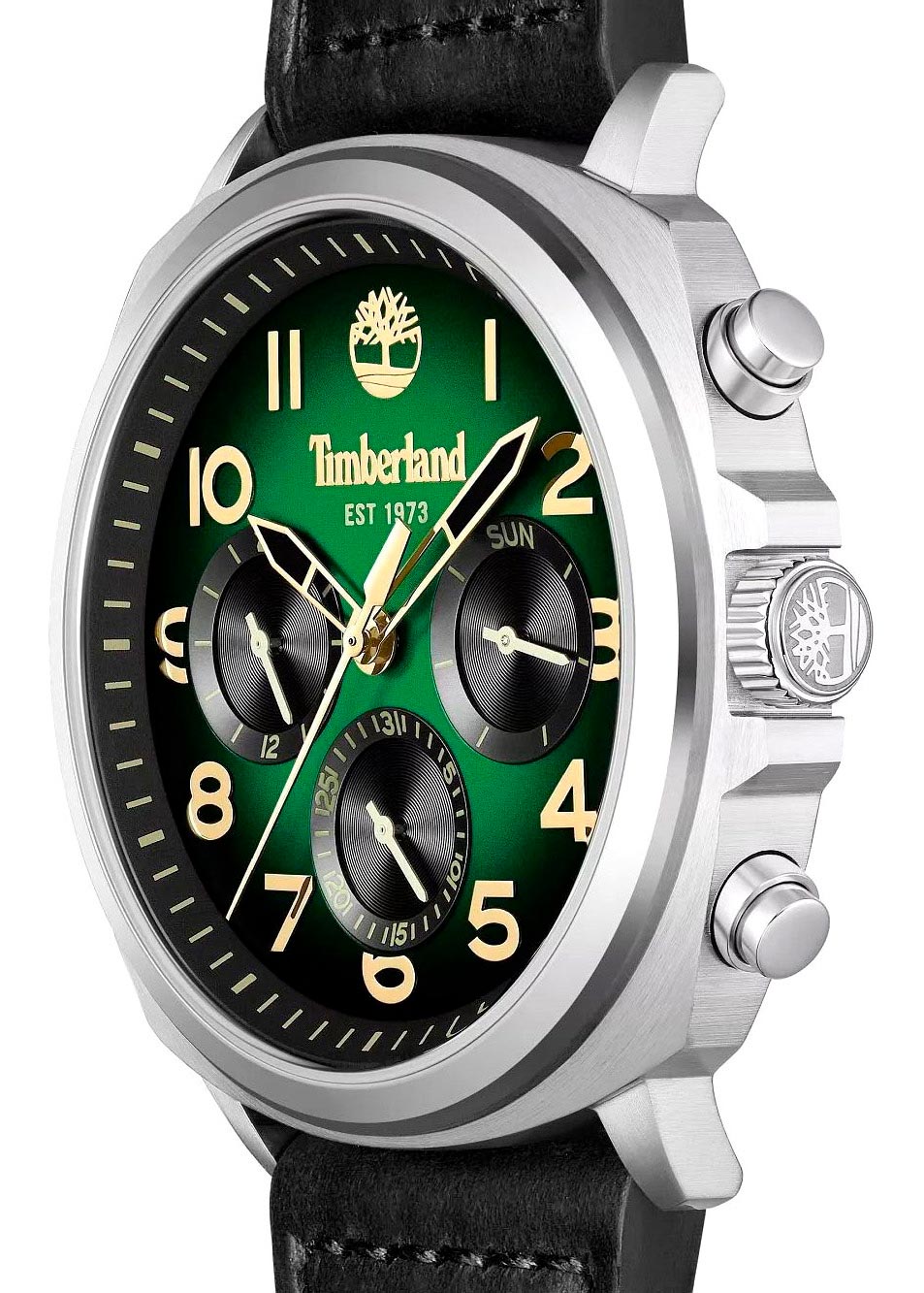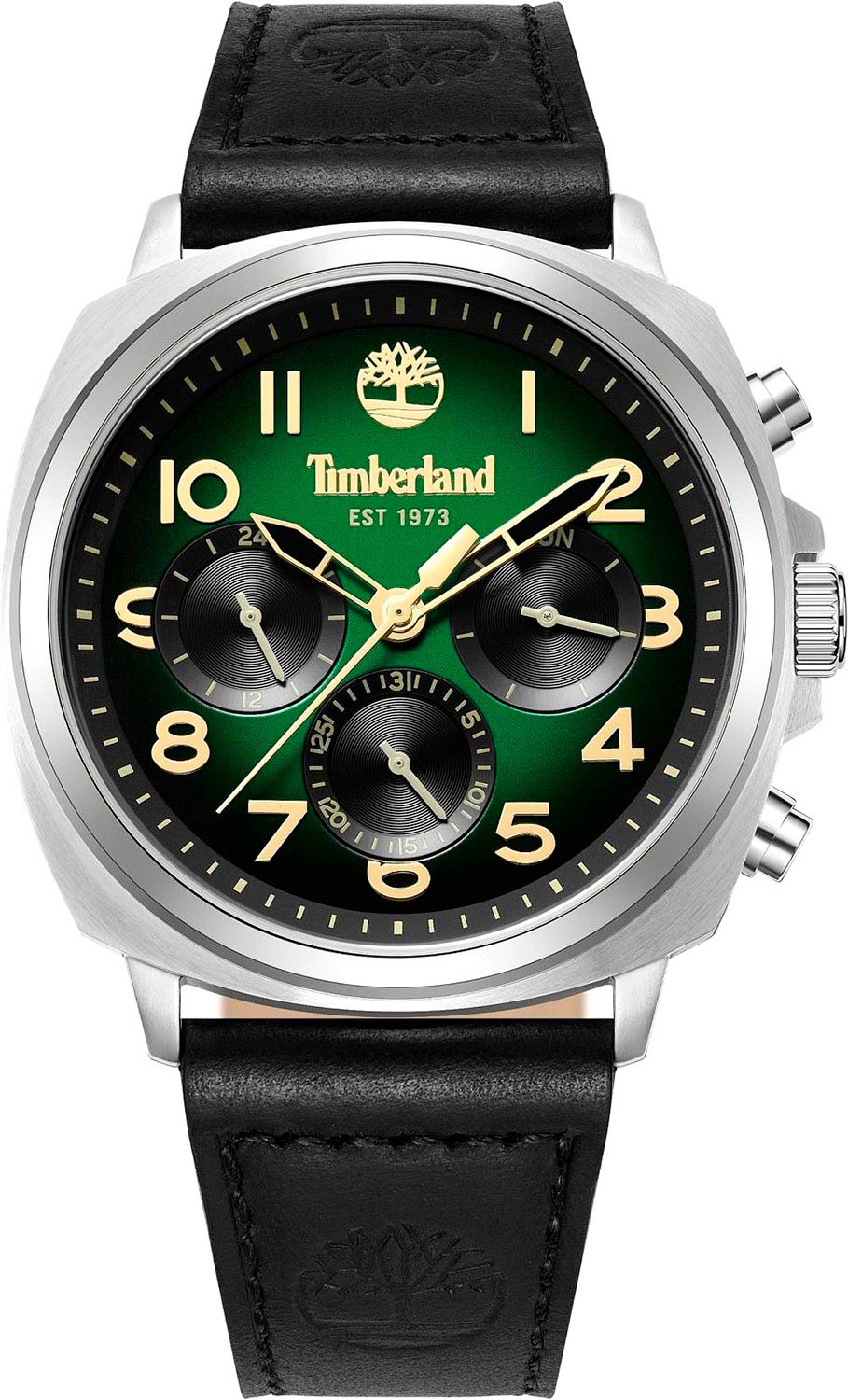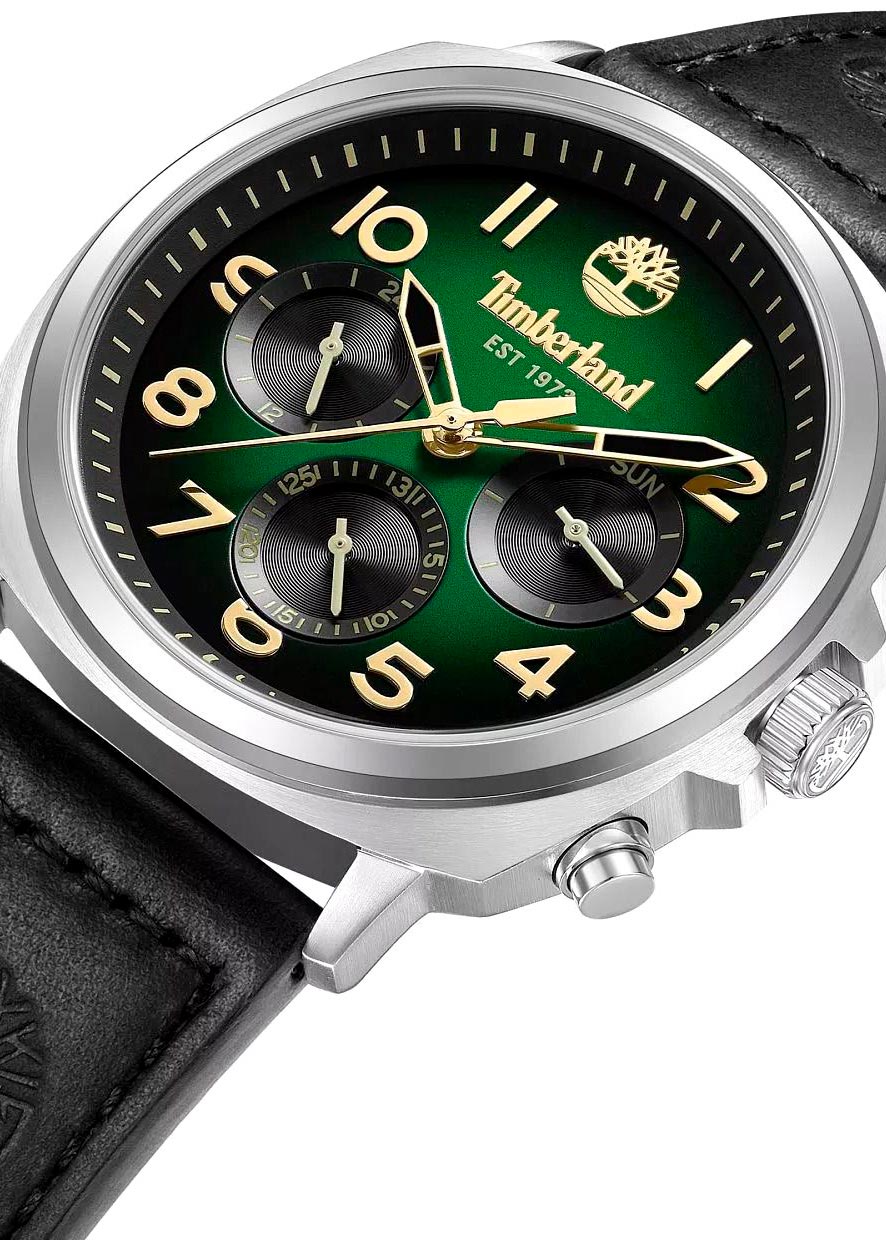 12-ти и 24-х часовой формат времени. Дата и день недели вынесены на отдельные циферблаты. Рифленая заводная головка с защитой. Завинчивающаяся задняя крышка. Заводная головка и задняя крышка украшены фирменным логотипом компании Timberland. Кожаный ремешок с классической застежкой и системой быстрой замены.