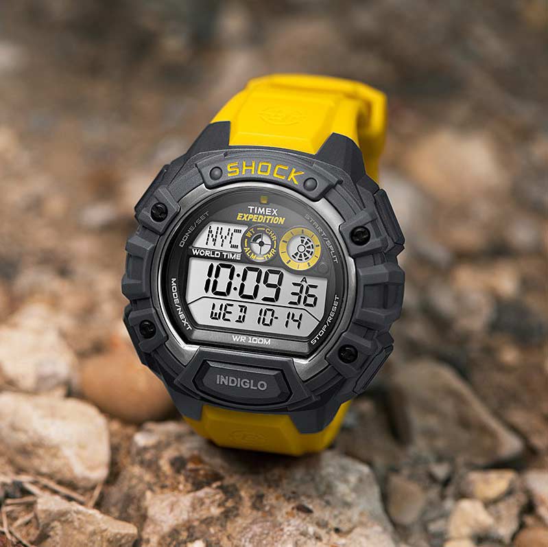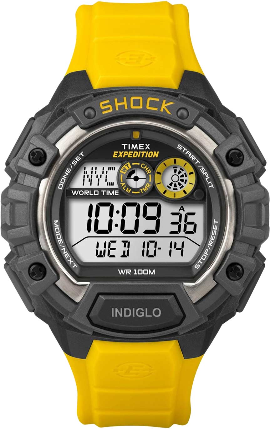 Цифровое время в ударопрочном облачении для уверенных в себе мужчин. Expedition World Shock. Сплит-хронограф на 100ч, с памятью на 30 кругов. Таймер обратного отсчета до 24ч. Мировое время. Противоударный корпус из пластика. Задняя крышка крепится на 4 винтах. Удобный пластиковый ремешок с классической застежкой.