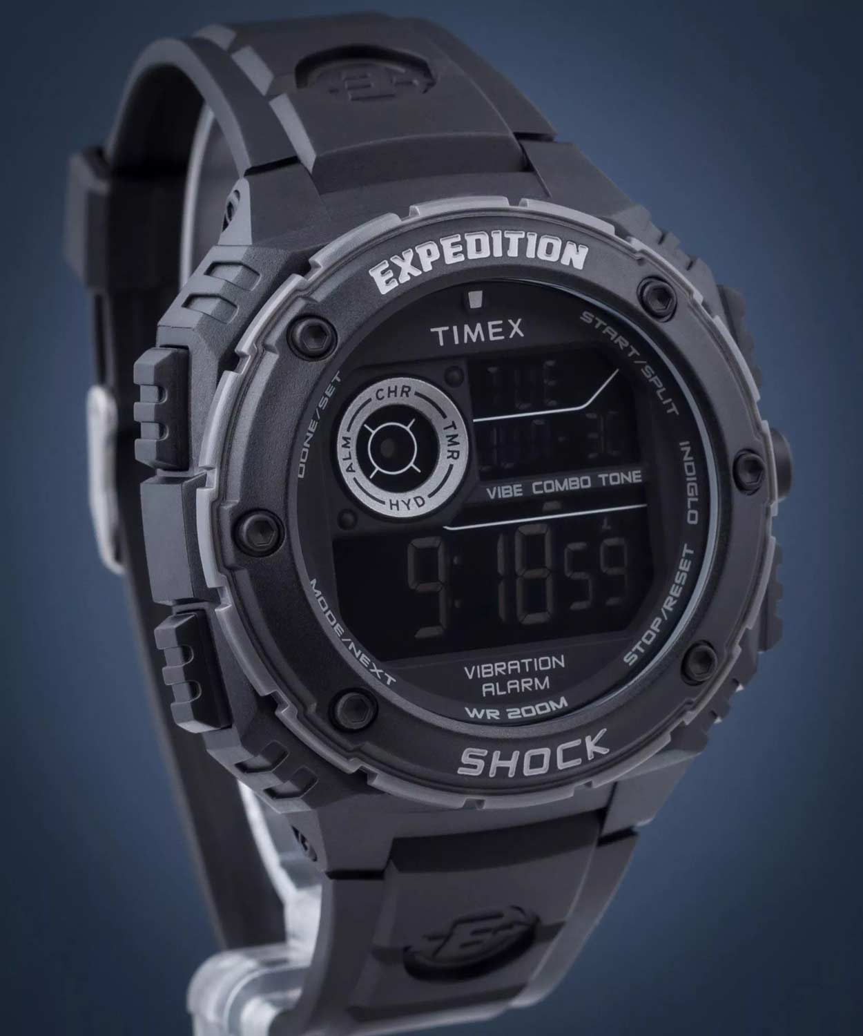 Ультрасовременный дизайн станет еще одним аргументом в пользу этого аксессуара. Отличный вариант для спорта и отдыха. Expedition Vibe Shock. Сплит-хронограф на 100ч, с памятью на 30 кругов. Таймер обратного отсчета до 24ч. 3 часовых пояса. Противоударный корпус из пластика. Задняя крышка крепится на 4 винтах. Удобный пластиковый ремешок с классической застежкой.