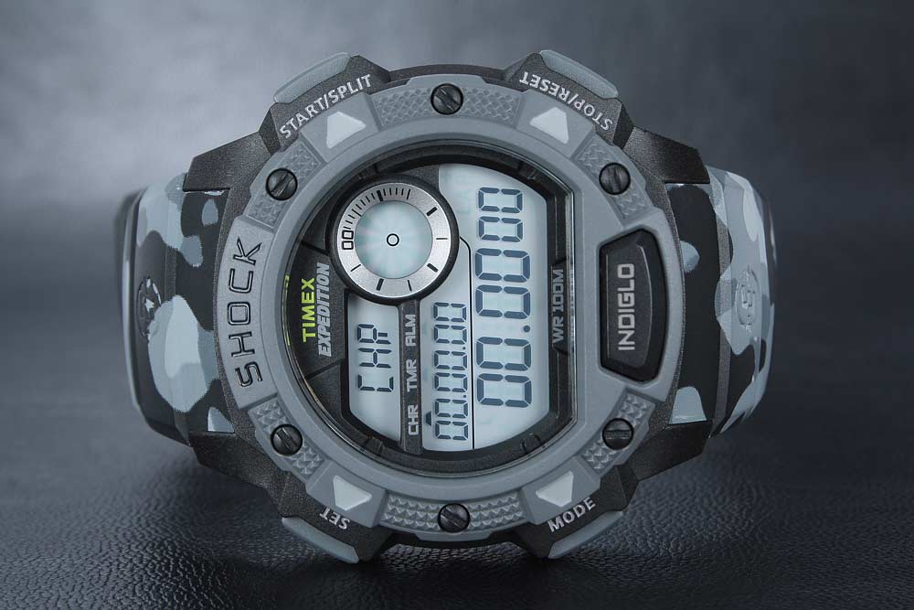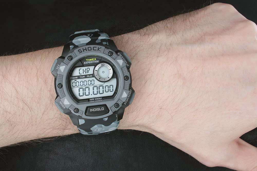 Серьезный внешний вид часов, облаченный в защитный камуфляж, непременно обратит на себя внимание мужчин с настоящим характером. Expedition Base Shock. Сплит-хронограф на 100ч, с памятью на 30 кругов. Таймер обратного отсчета до 24ч. Мировое время. Противоударный корпус из пластика. Задняя крышка крепится на 4 винтах. Удобный каучуковый ремешок с классической застежкой.