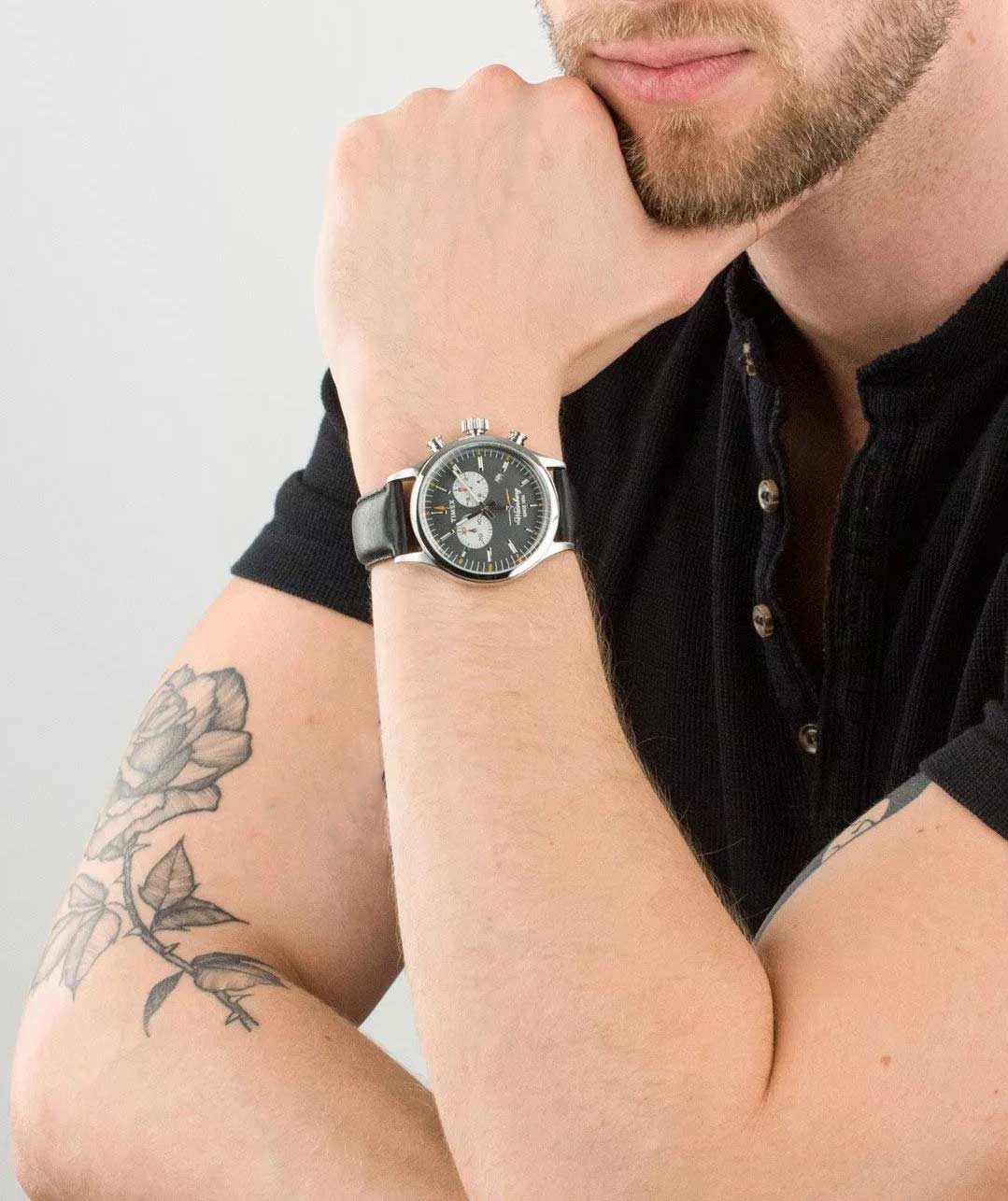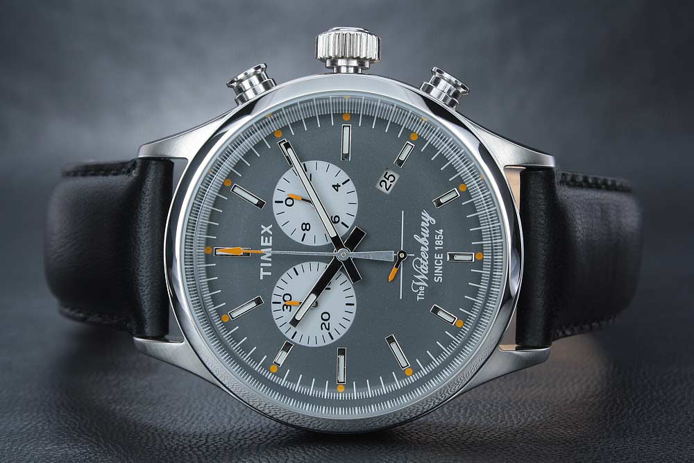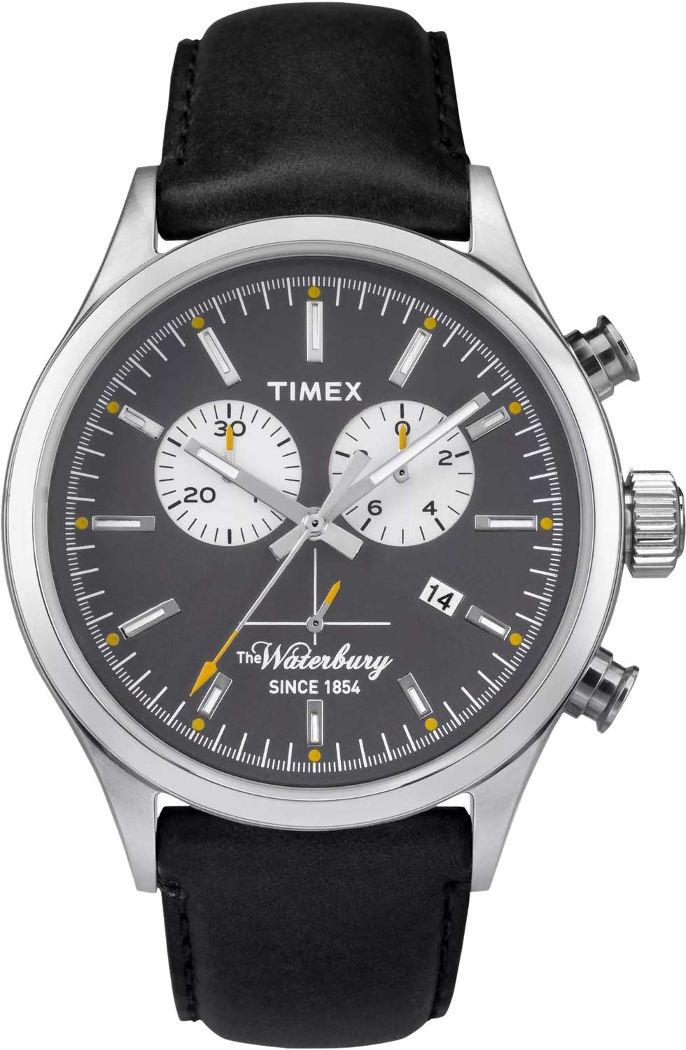 Выразительный дизайн этого мужского аксессуара станет отправной точкой стильного образа на каждый день. The Waterbury Chronograph. Часы-хронограф с секундомером точностью 1/20с. Круглый стальной корпус. Циферблат с метками в виде штрихов. Окошко даты находится в положении 4 часа. Рифленая заводная головка. Кожаный ремешок с классической застежкой.