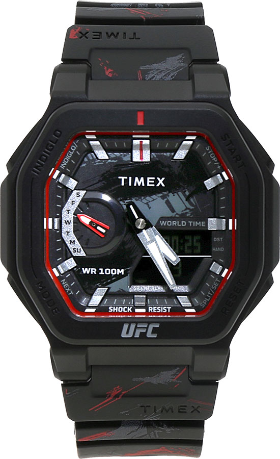 Эти стильные спортивные часы помогут поддерживать идеальную физическую форму с хорошим настроением. Часы-хронограф с секундомером UFC Colossus Fight Week. Аналоговый и цифровой циферблаты. Цифровой дисплей показывает: хронограф с памятью на 24 круга, 12-ти и 24-х часовой формат времени, таймер обратного отсчета до 24 ч, настраиваемый будильник, календарь. Подсветка дисплея Indiglo. Рифленая заводная головка с защитой. Пластиковый ремешок с классической застежкой.