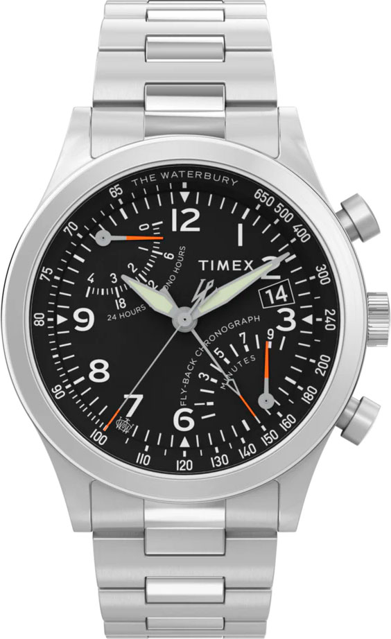 Функциональные часы с ретроградными указателями - отличный выбор для мужчин, которые ценят практичность и индивидуальность. Мужские часы-хронограф с секундомером Waterbury Traditional Fly Back. Ретроградные указатели второго часового пояса и хронографа. Функция Flyback. Метки в виде арабских цифр. Стрелки с люминесцентным покрытием, которое светится в темноте после непродолжительной зарядки на свету. Окошко даты находится между отметками 2 и 3 часов. Рифленая заводная головка. Надежный стальной браслет с раскладывающейся застежкой.