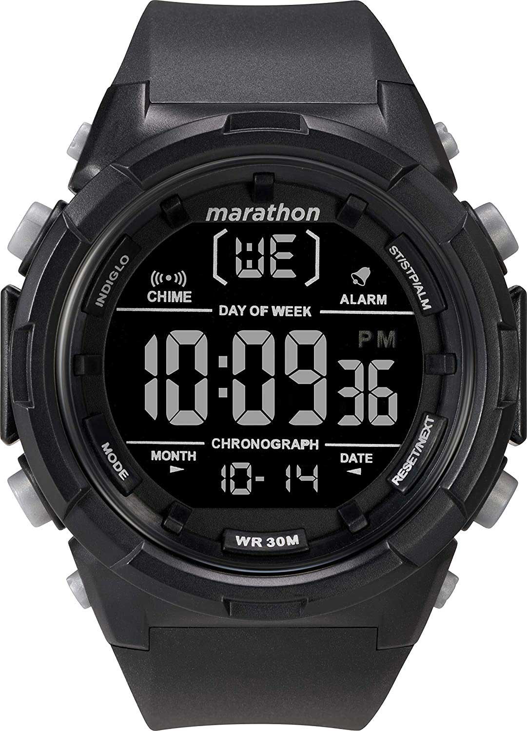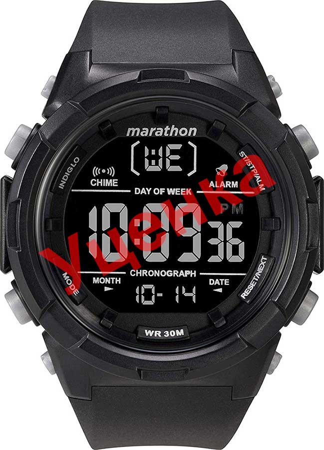 Marathon. Электронный SPLIT-хронограф с секундомером. Функция ежедневного будильника. Отображение числа, дня недели и месяца. Циферблат с фирменной подсветкой Indiglo. Стальная задняя крышка крепится на 4-х винтах. Ремешок с классической застежкой.