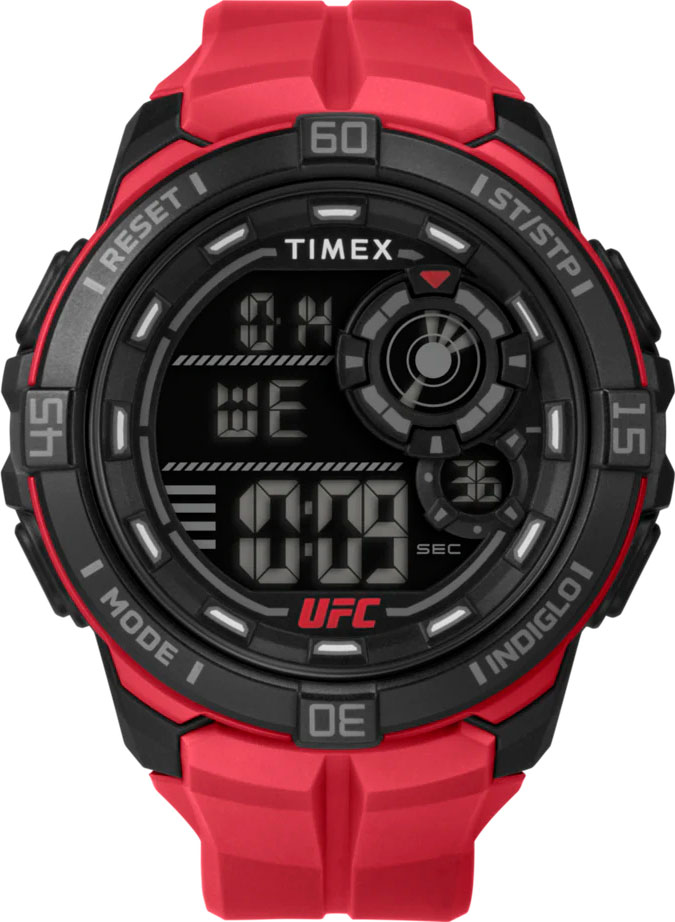 Спортивный, очень динамичный характер часов непременно понравится спортсменам и людям, ведущим активный образ жизни. Электронные наручные часы UFC Rush. 12-ти и 24-х часовой формат времени. Второй часовой пояс. Хронограф, секундомер и таймер обратного отсчета. Функция будильника. Циферблат с подсветкой Indiglo. Ремешок с классической застежкой.