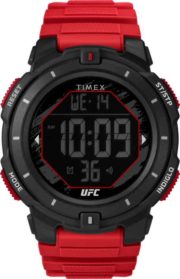 Спортивный, очень динамичный характер часов непременно понравится спортсменам и людям, ведущим активный образ жизни. Электронные наручные часы UFC Rumble. 12-ти и 24-х часовой формат времени. Хронограф, секундомер и таймер обратного отсчета. Функция будильника. Циферблат с подсветкой Indiglo. Ремешок с классической застежкой.