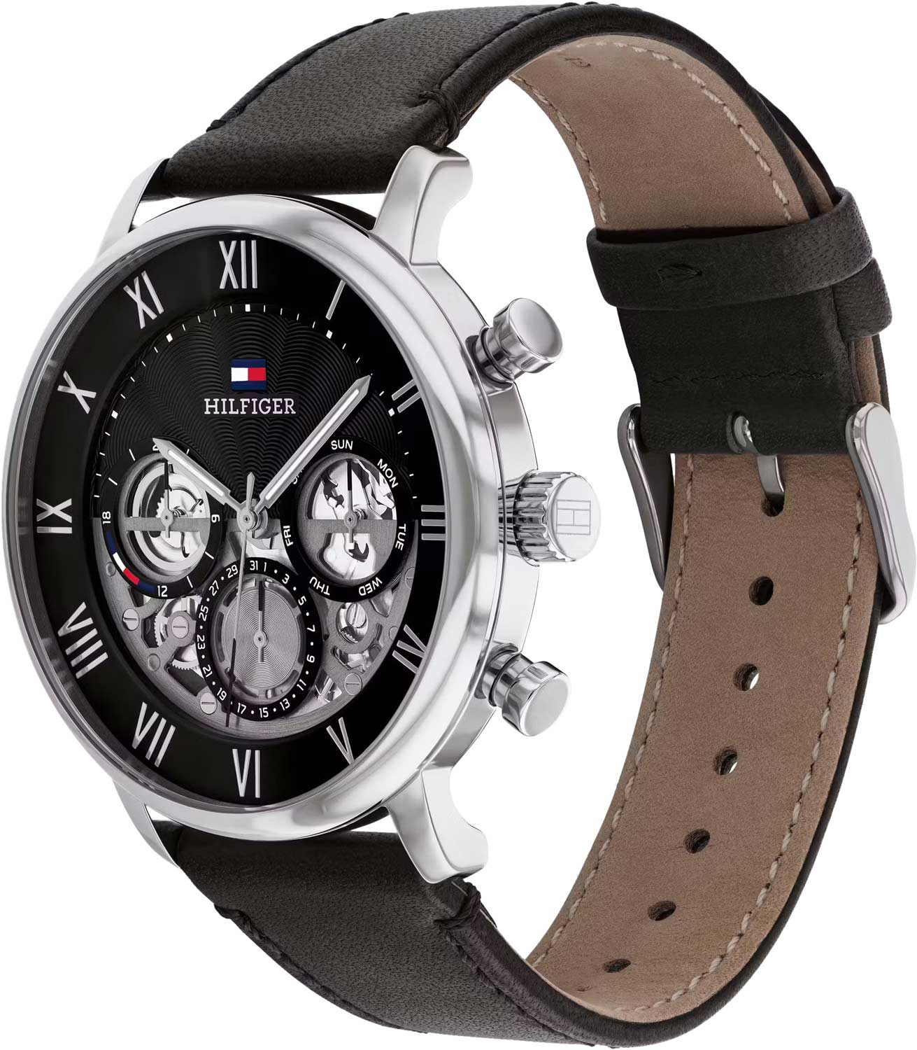 Время в 24-х часовом формате, дата и день недели вынесены на отдельные циферблаты. Рифленая заводная головка. Кожаный ремешок с классической застежкой.