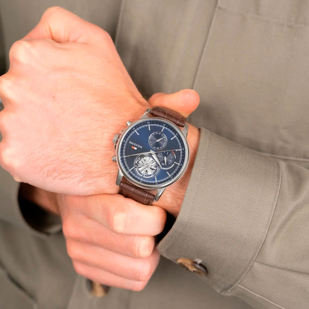 Функциональные, стильные, привлекательные часы для уверенных в себе мужчин. Мужские часы Stewart с круглым стальным корпусом. 12-ти и 24-х часовой формат времени. Время в 24-х часовом формате, дата и день недели вынесены на отдельные циферблаты. Сквозь прозрачное окошко на циферблате можно наблюдать за работой механизма часов. Метки в виде штрихов. Рифленая заводная головка с защитой. Кожанный ремешок с классической застежкой.
