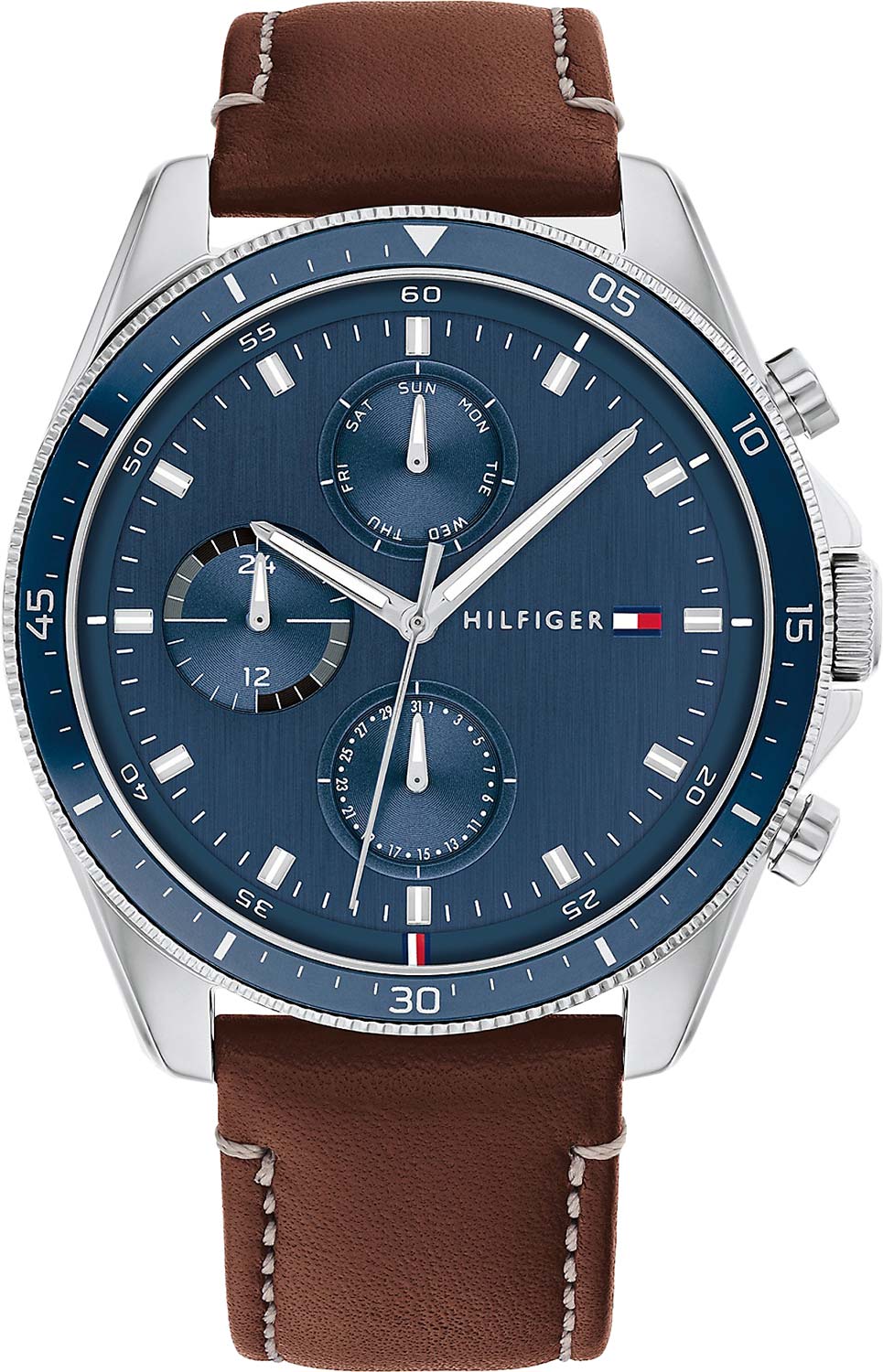 Часы Tommy Hilfiger созданы для ценителей модных и практичных аксессуаров. Parker. Метки в виде штрихов. 12-ти и 24-х часовой формат времени. Время в 24-х часовом формате, дата и день недели вынесены на отдельные циферблаты. Заводная головка с защитой. Ремешок с классической застежкой.