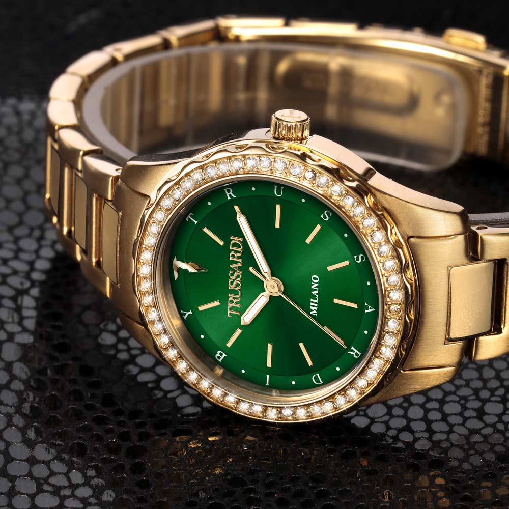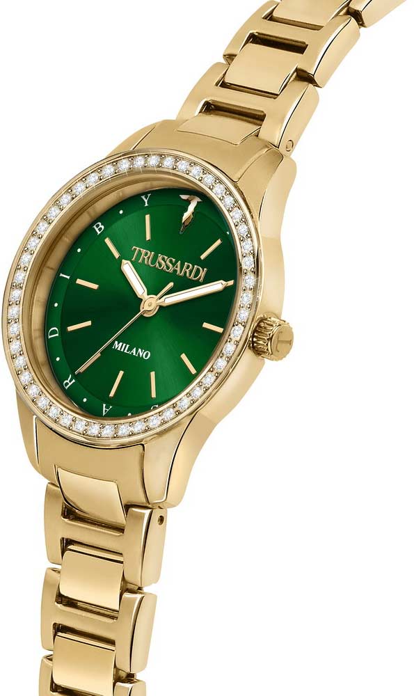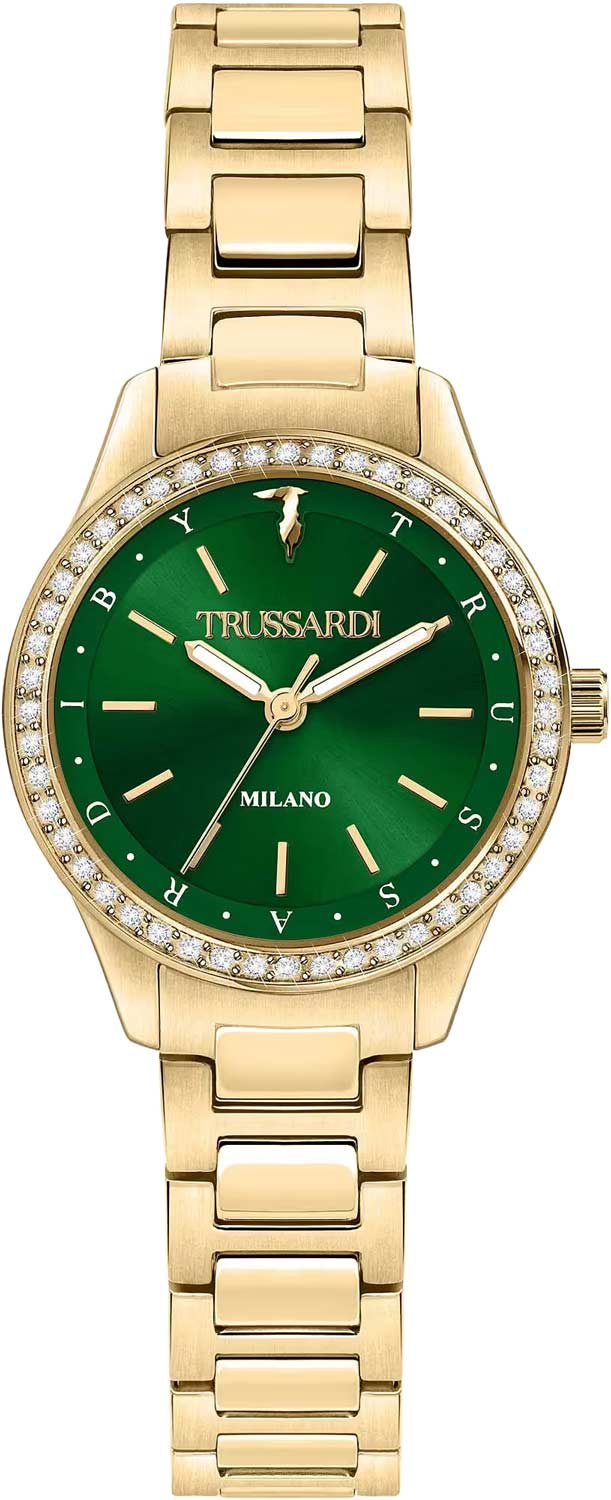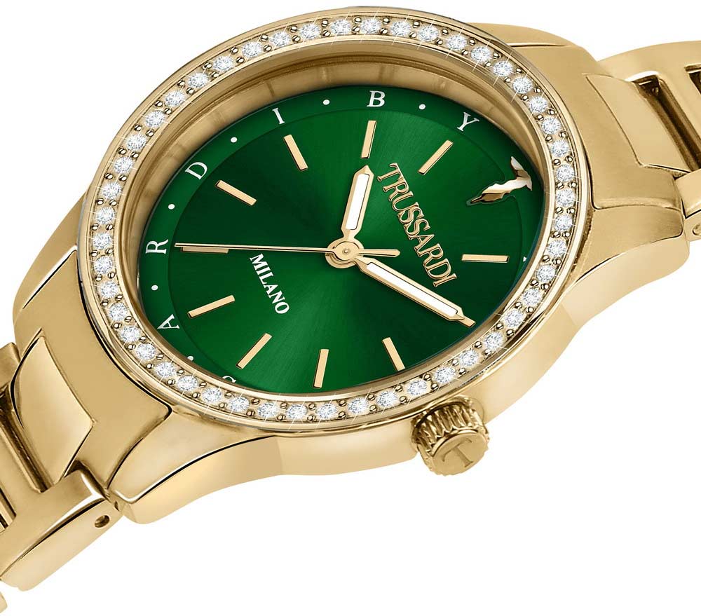 Эффектный аксессуар, чтобы подчеркнуть вашу индивидуальность. Женские наручные часы. Круглый стальной корпус. Безель инкрустирован кристаллами. Циферблат выполнен по технологии Sunray (солнечные лучи). Метки в виде штрихов. По краю циферблата нанесена надпись ''By Trussardi''. Рифленая заводная головка. Надежный стальной браслет с раскладывающейся застежкой.