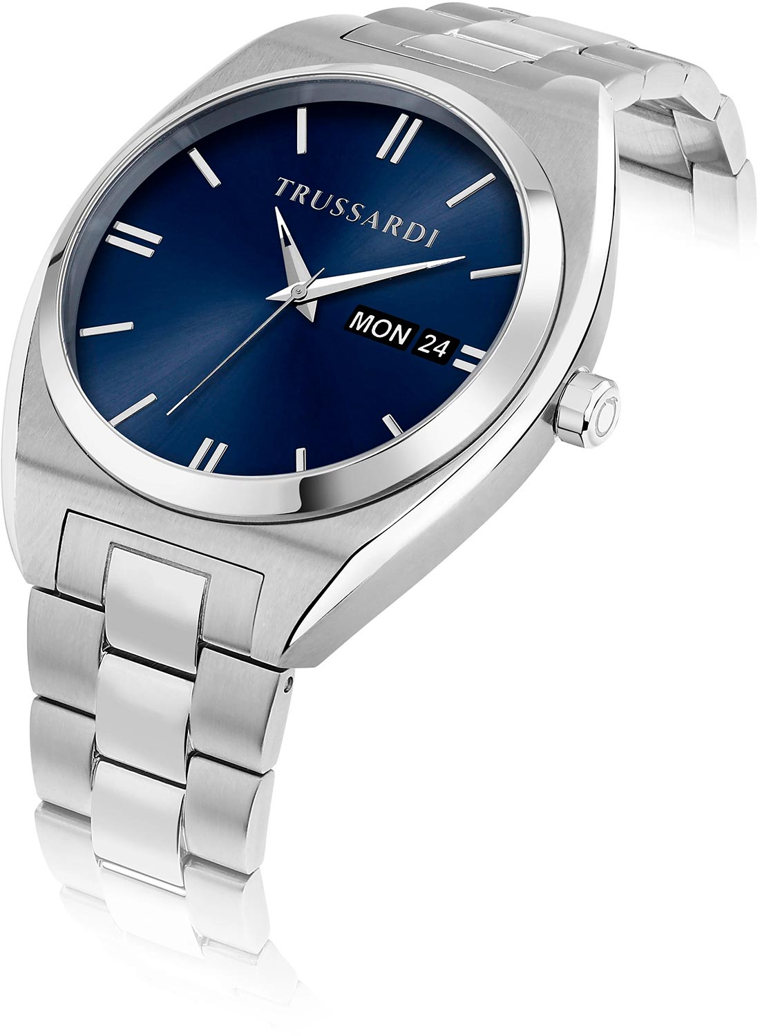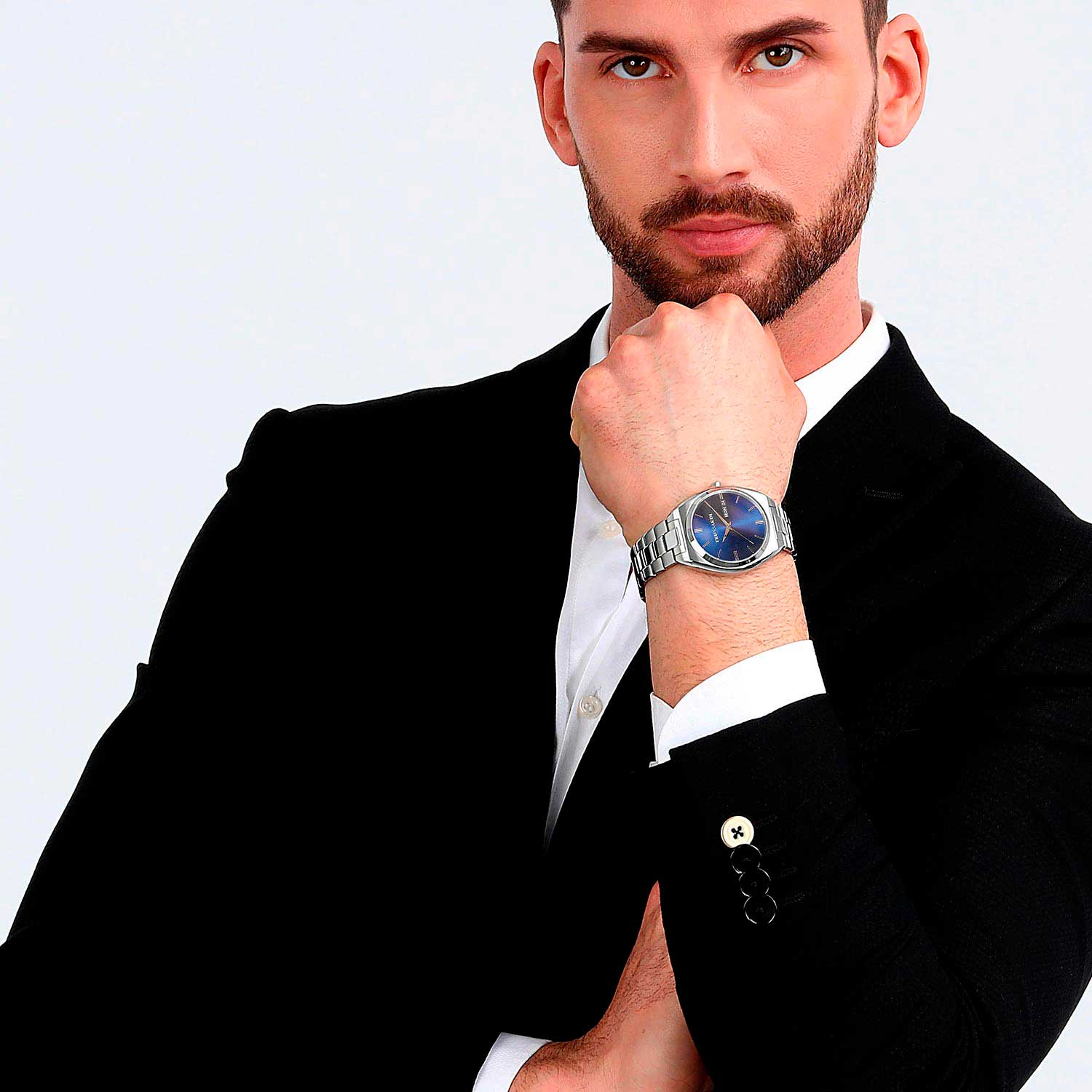 Имидж успешного мужчины всегда будет на высоте со столь надежным и практичным аксессуаром на руке. Наручные кварцевые мужские часы. Стальной корпус с матовой и полированной отделкой. Циферблат выполнен по технологии Sunray (солнечные лучи). Накладные метки в виде штрихов. Окошки даты и дня недели находятся в положении 3 часа. Клиновидные стрелки в стиле Dauphine с люминесцентным покрытием, которое светится в темноте после непродолжительной зарядки на свету. Рифленая заводная головка в форме болта. Стальной браслет с матовой и полированной отделкой с раскладывающейся застежкой.
