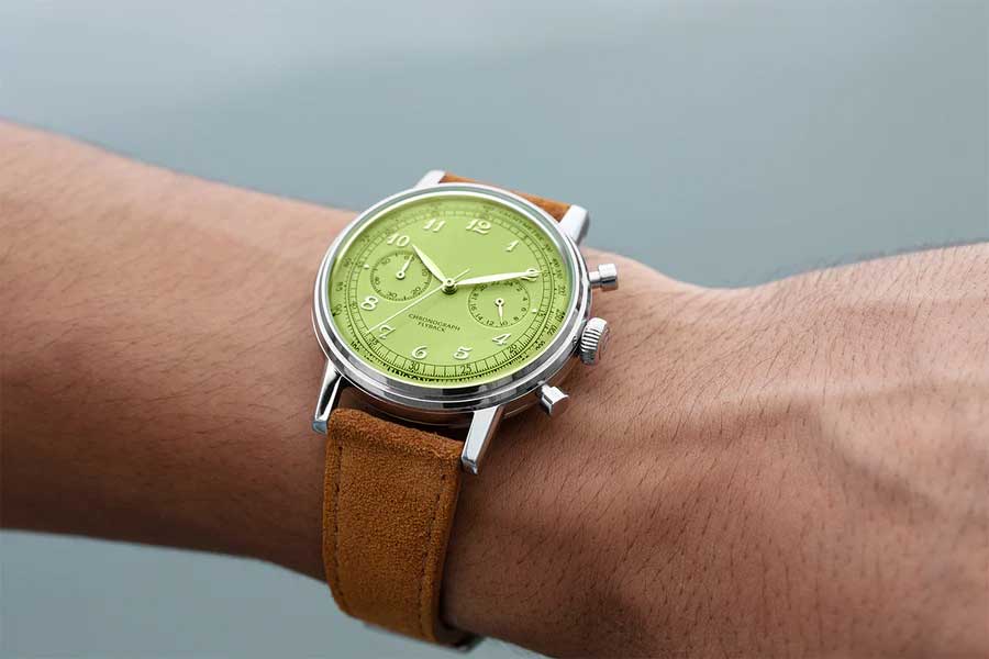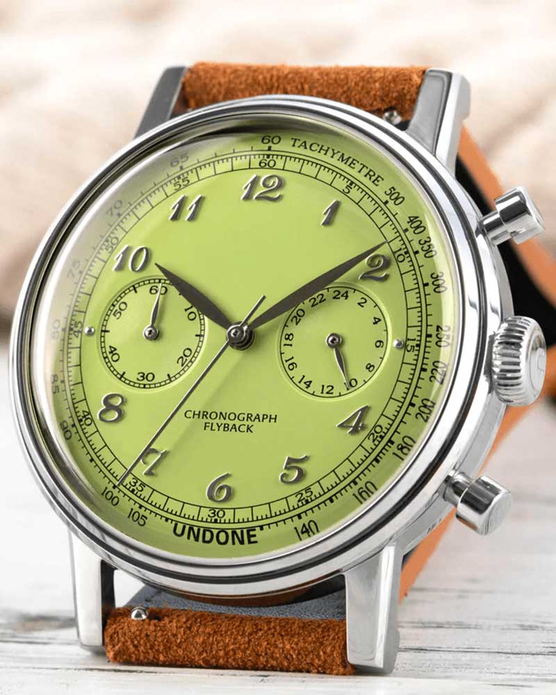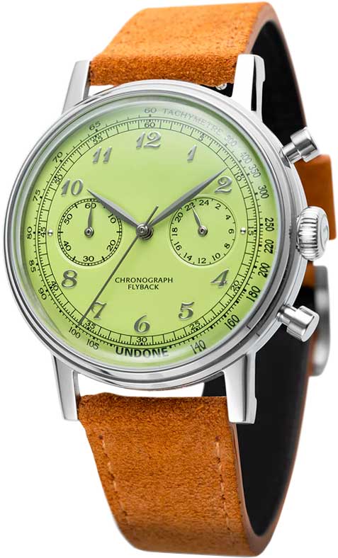 Urban Vintage Pistachio Crisp. Часы-хронограф с секундомером и тахиметром. 12-ти и 24-х часовой формат времени. Круглый корпус выполнен из стали 316L. Циферблат с метками в виде арабских цифр. Рифленая заводная головка. Ремешок с классической застежкой и системой быстрой замены.