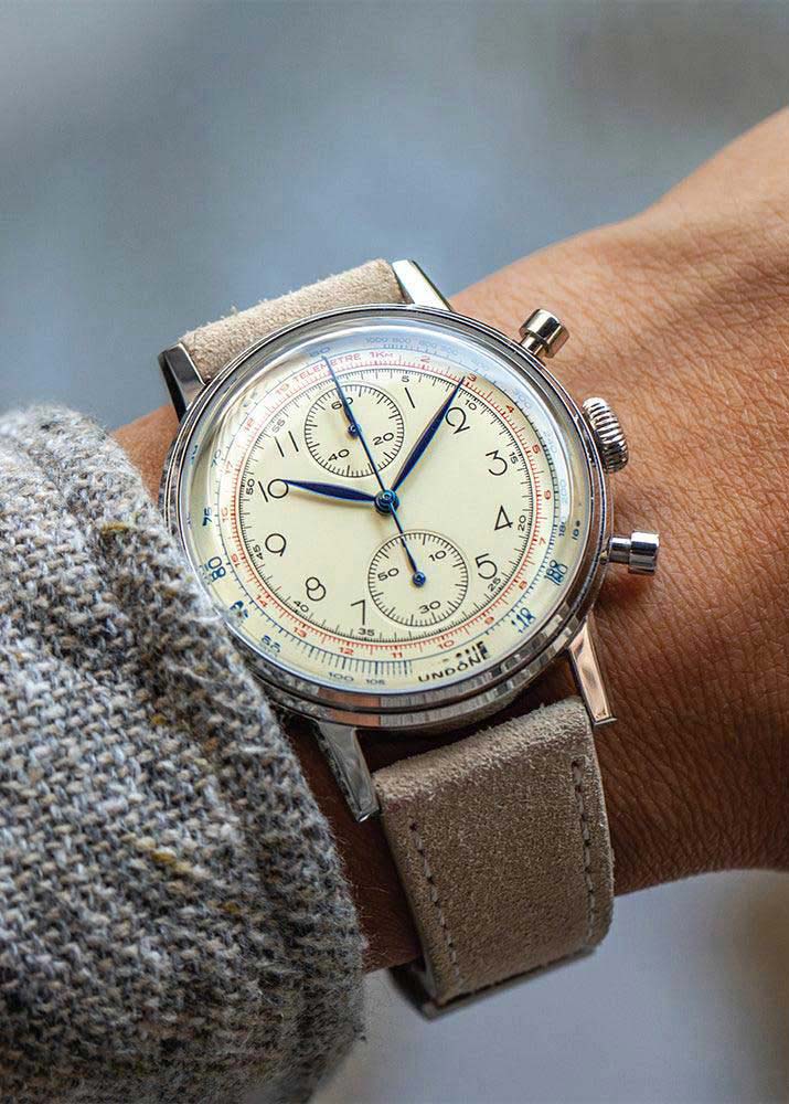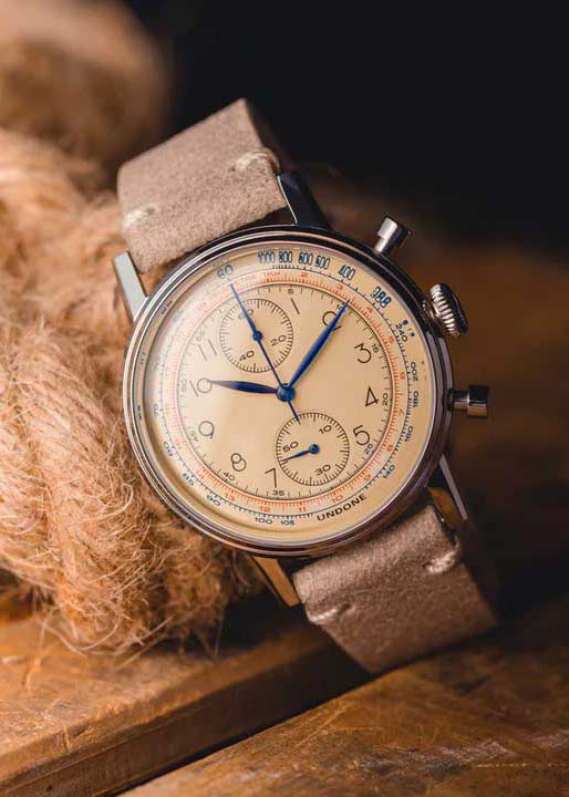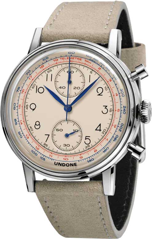 Urban Vintage Killy. Часы-хронограф с секундомером и тахиметром. Круглый корпус выполнен из стали 316L. Циферблат с метками в виде арабских цифр. Рифленая заводная головка. Телеметрическая шкала. Прозрачная задняя крышка. Ремешок с классической застежкой и системой быстрой замены.