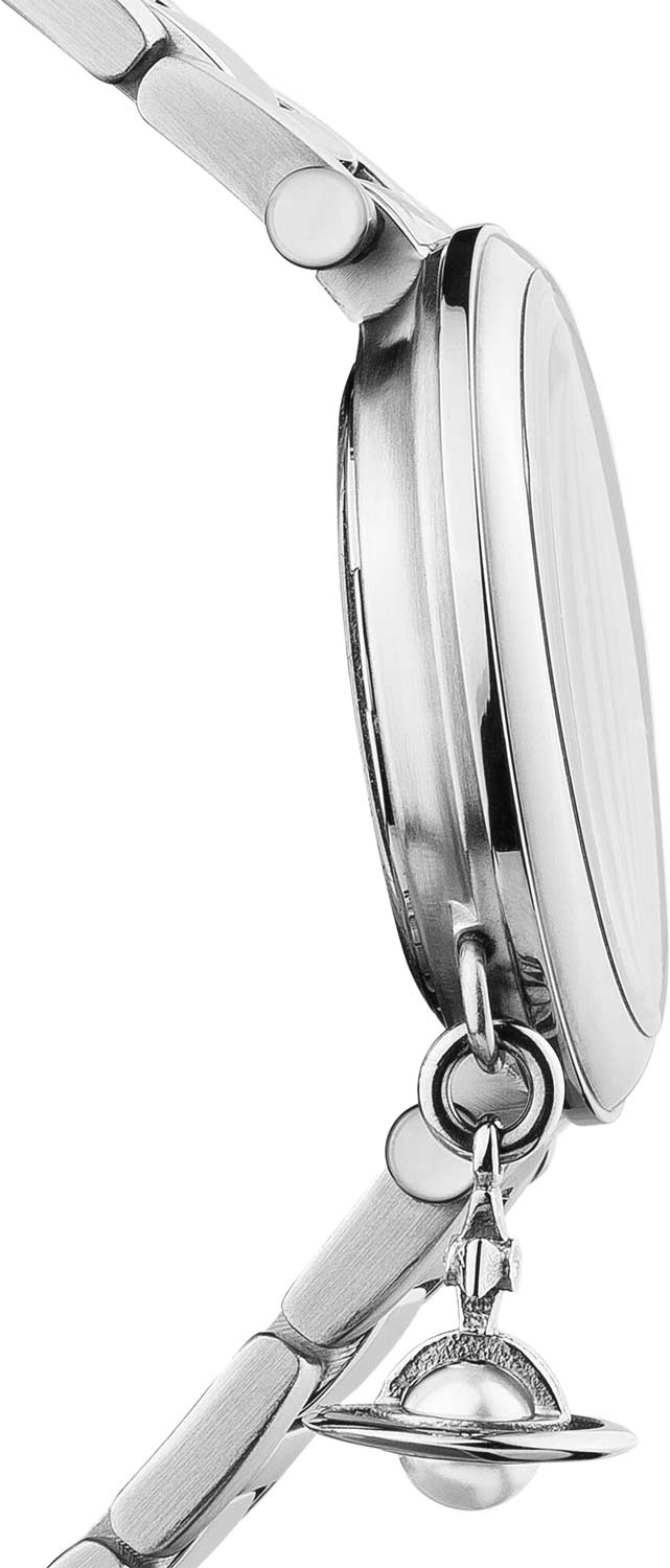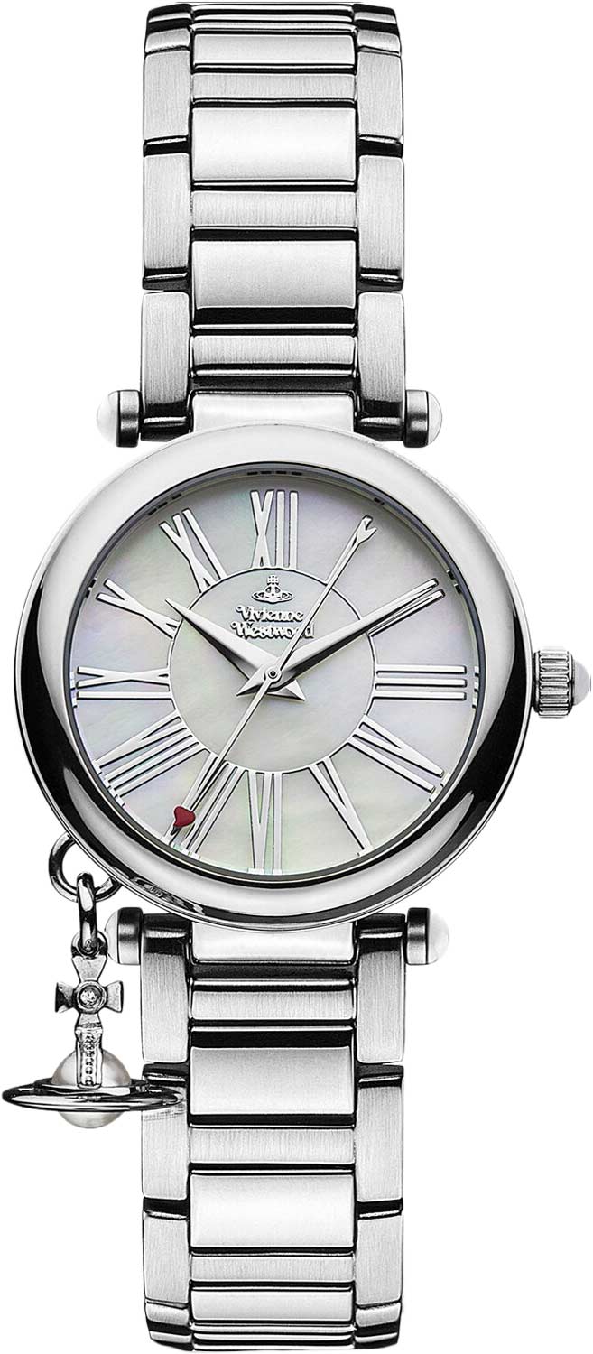 Часы от Vivienne Westwood — это не просто аксессуар, это вызов настоящему, чтобы стать лучше в будущем. Такая модель привнесет нотки элегантности, утонченности и шикарного стиля в ваш повседневный образ. Женские наручные часы Mother Orb. Круглый стальной корпус с подвеской. Перламутровый циферблат с метками в виде римских цифр дополнен логотипом бренда. Секундная стрелка украшена красным сердцем. Рифленая заводная головка украшена камнем в форме кабошона. Удобный стальной браслет.