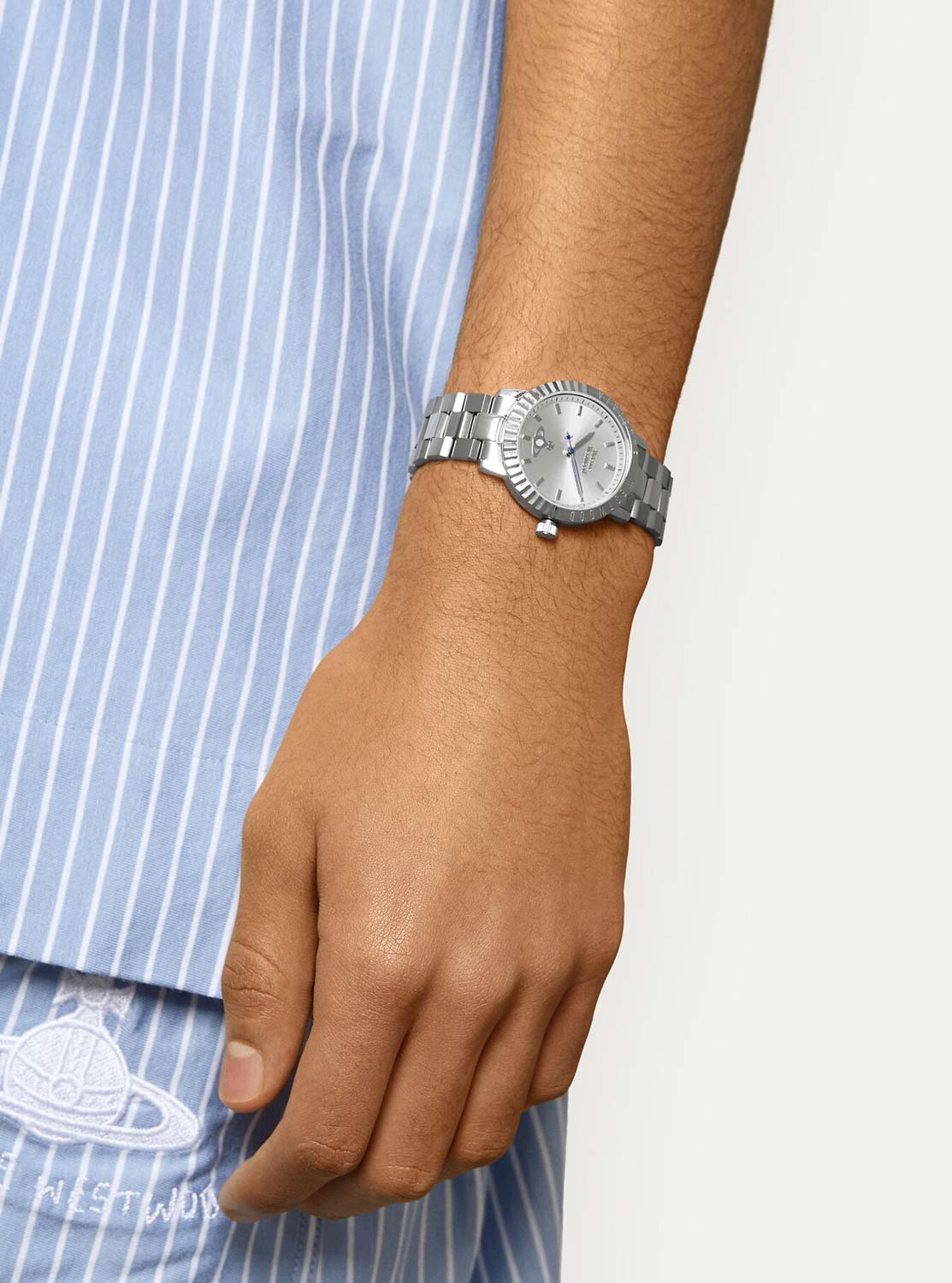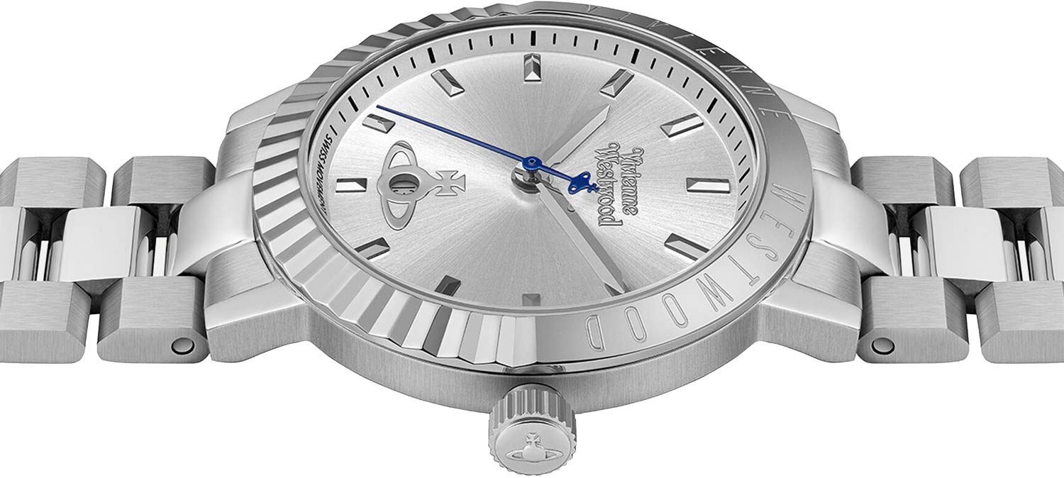 Окошко даты находится в положении 6 часов. Заостренные прямоугольные стрелки в стиле Baton. Рифленая заводная головка. Удобный стальной браслет с раскладывающейся застежкой.