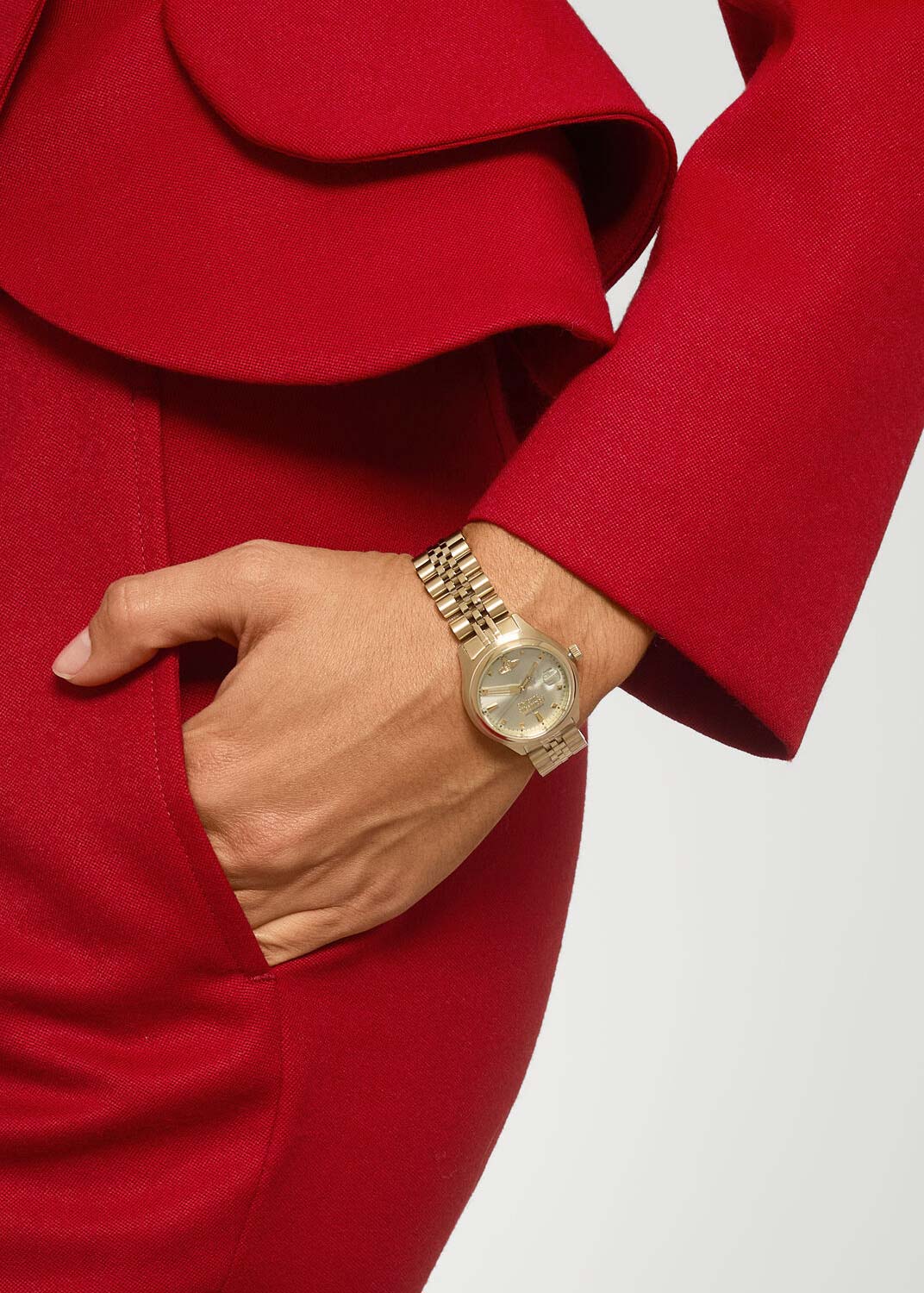 Скелетонизированные стрелки. Окошко даты с увеличительным стеклом находится в положении 3 часа. Рифленая заводная головка. Удобный стальной браслет с раскладывающейся застежкой.
