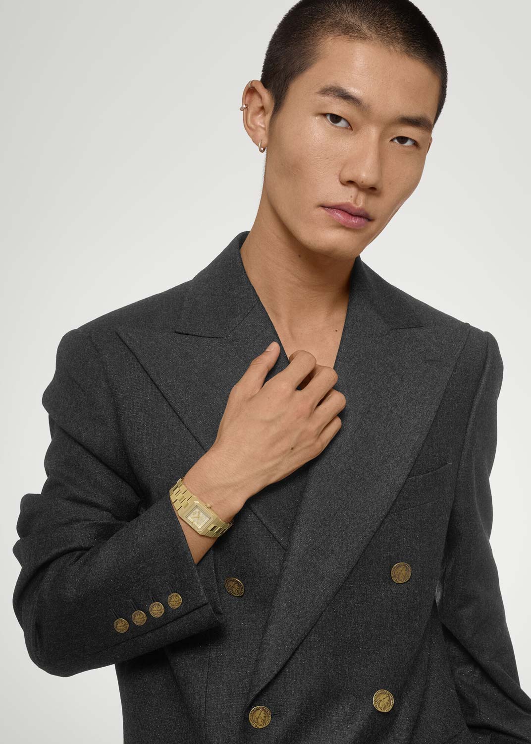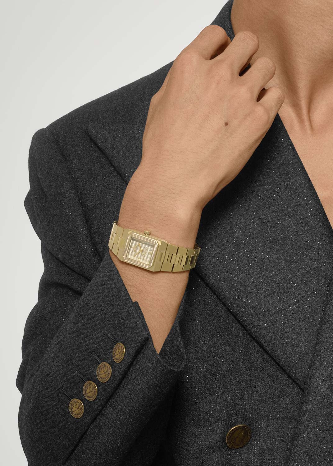 Brunswick. Наручные унисекс часы. Стальной квадратный корпус. Рифленый безель. Циферблат с узором Clous de Paris украшен фирменным логотипом. Накладные метки в виде штрихов. Прямоугольные стрелки в стиле Baton. Рифленая заводная головка. Удобный стальной браслет с раскладывающейся застежкой.