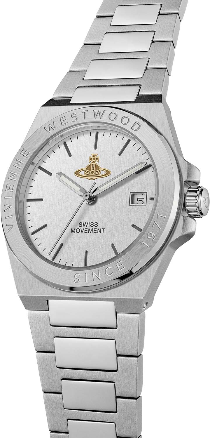 Hanwell. Наручные унисекс часы. Круглый стальной корпус. Безель с гравировками ''Vivienne Westwood'' и ''Since 1971''. Циферблат метками в виде штрихов украшен фирменным логотипом. Окошко даты находится в положении 3 часа. Заостренные стрелки в стиле Baton. Рифленая заводная головка с защитой. Удобный стальной браслет с раскладывающейся застежкой.