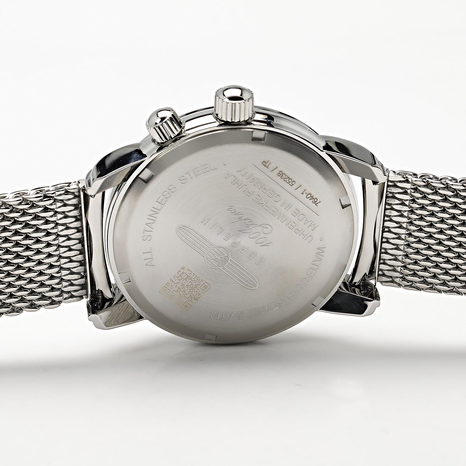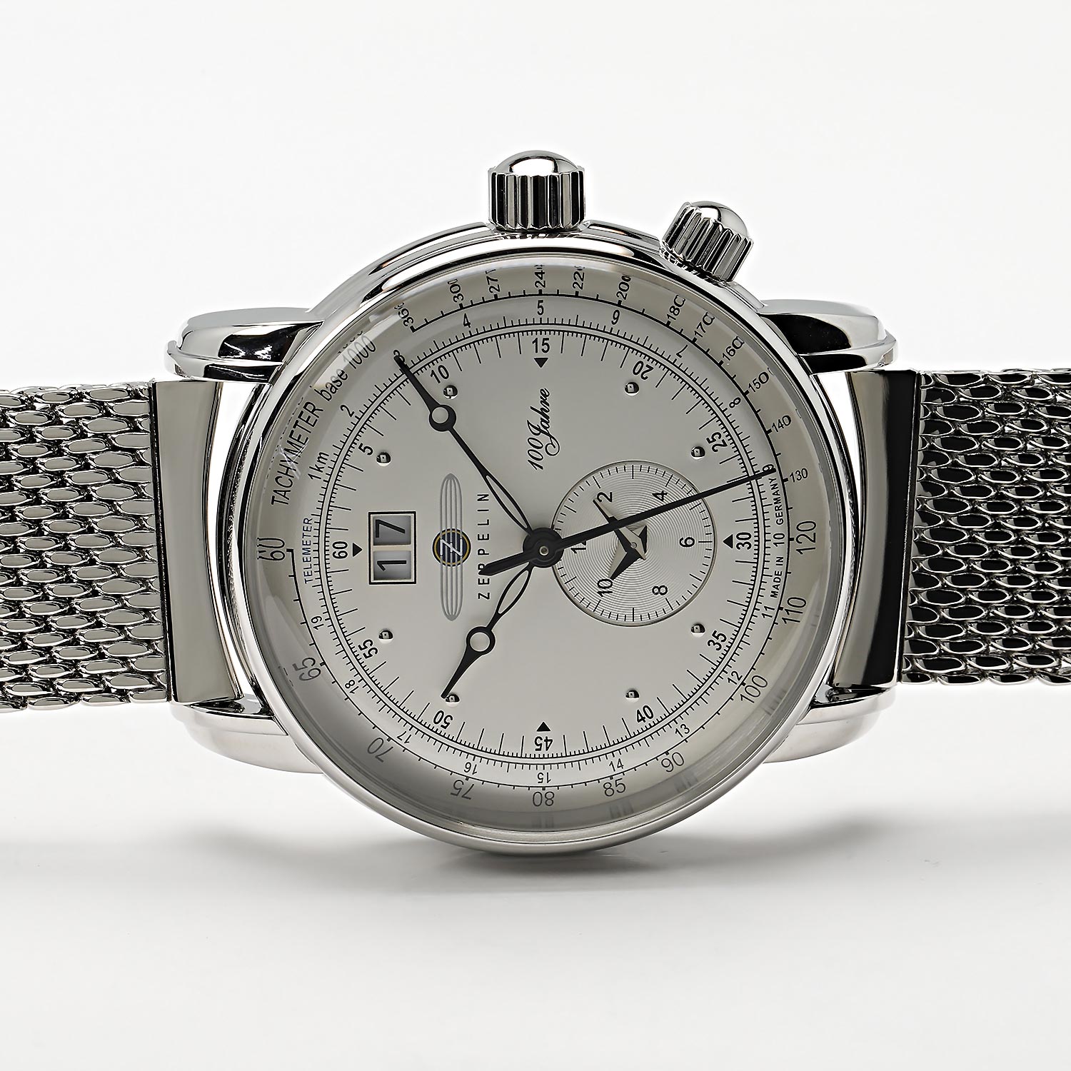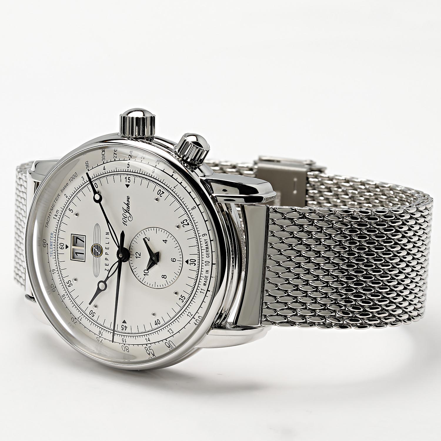 Многофункциональные, эргономичные часы с круглым корпусом на браслете миланского плетения - для смелых и решительных. Мужские часы 100 Years Zeppelin. Тахиметр. Телеметрическая шкала. Второй часовой пояс. Круглый стальной корпус. Рифленая заводная головка. Браслет миланского плетения.
