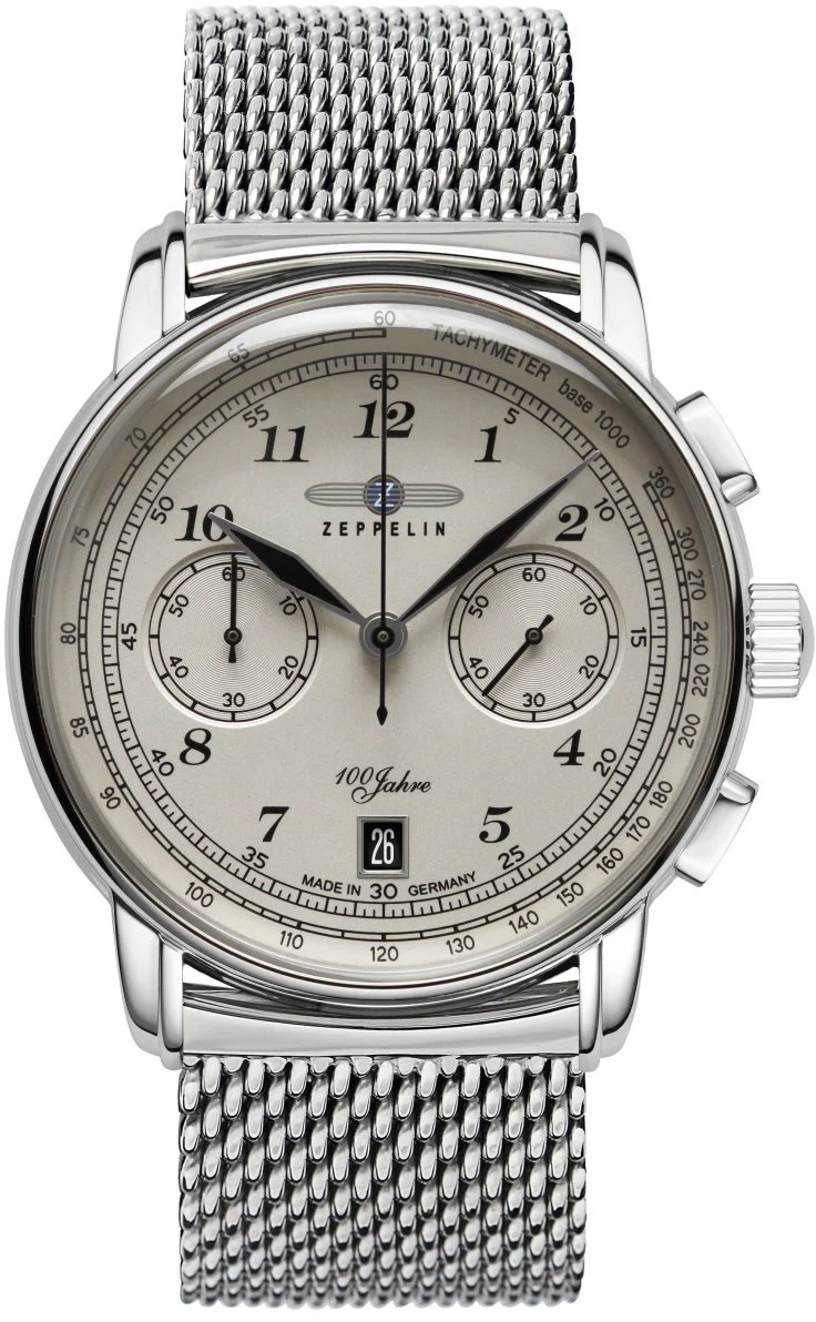 Классические часы с дополнительными функциями хронографа являются идеальным выбором для современного ритма жизни. 100 Years Zeppelin ED. 1. Часы-хронограф с секундомером и тахиметром. Телеметрическая шкала. Метки в виде арабских цифр. Окошко даты находится в положении 6 часов. Миланский браслет.