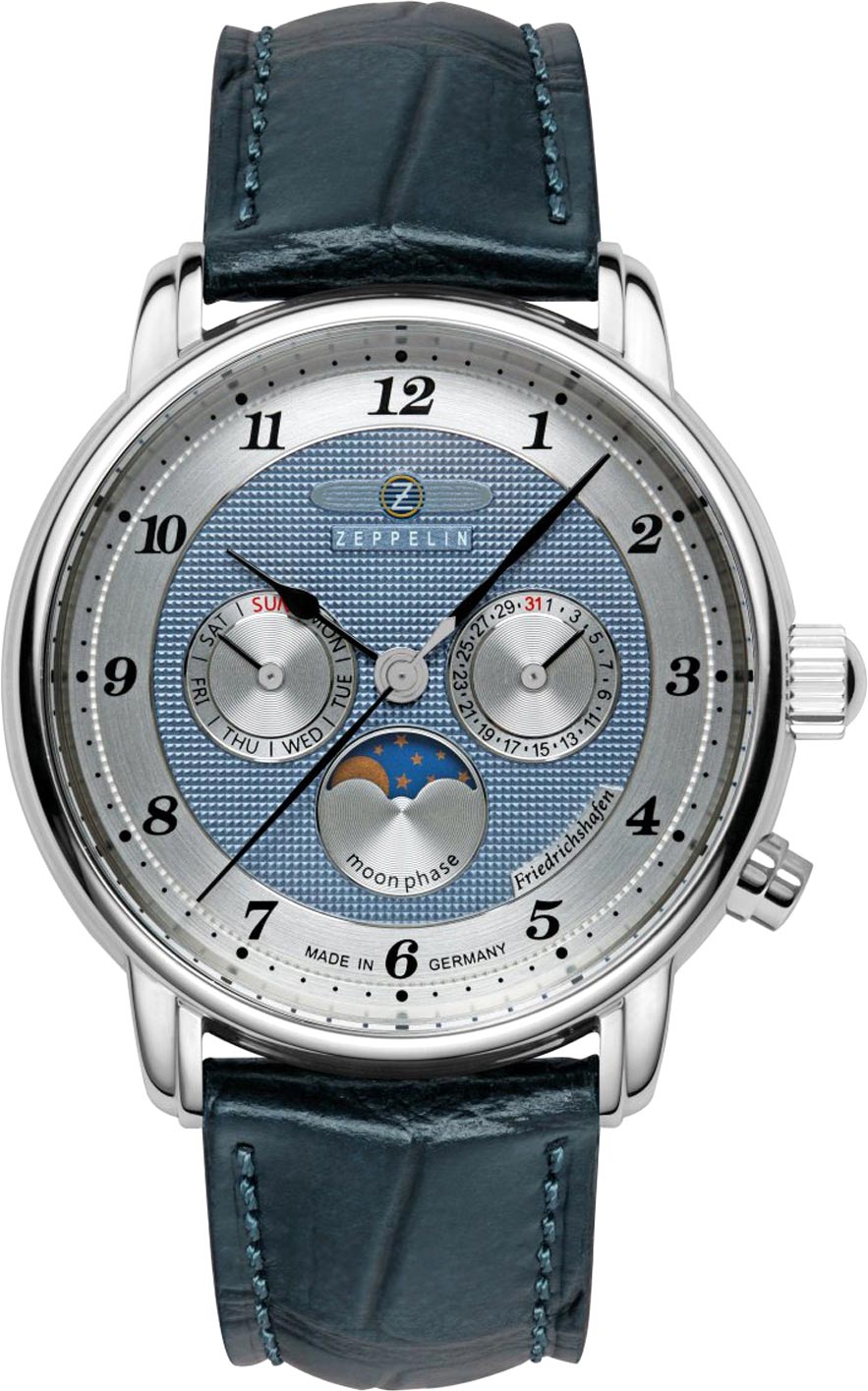 Мужские наручные кварцевые функциональные часы Friedrichshafen Moon Phase. Круглый корпус из полированной нержавеющей стали, изготовленный вручную с типичными кольцами Zeppelin по краю. Циферблат выполнен по технологии гильоше с узором Clous de Paris. Метки в виде арабских цифр.