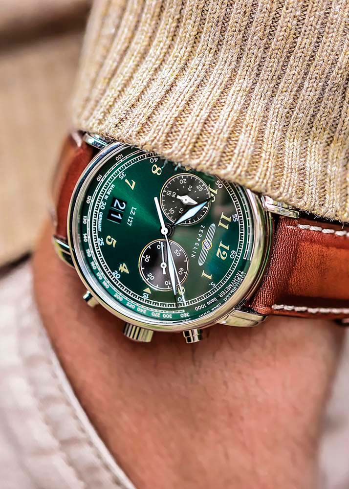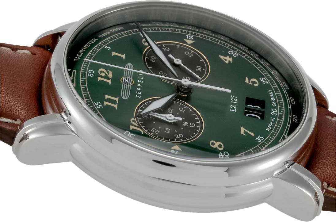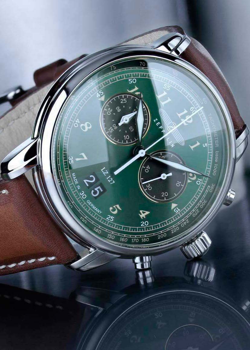 Этот хронограф обладает классическими чертами и превосходным исполнением. Отличные часы для стильных и современных. LZ127 Graf Zeppelin. В механизме 5 камней. Часы-хронограф с секундомером и тахиметром. Метки в виде арабских цифр. Окошко даты находится в положении 6 часов. Ремешок с классической застежкой.