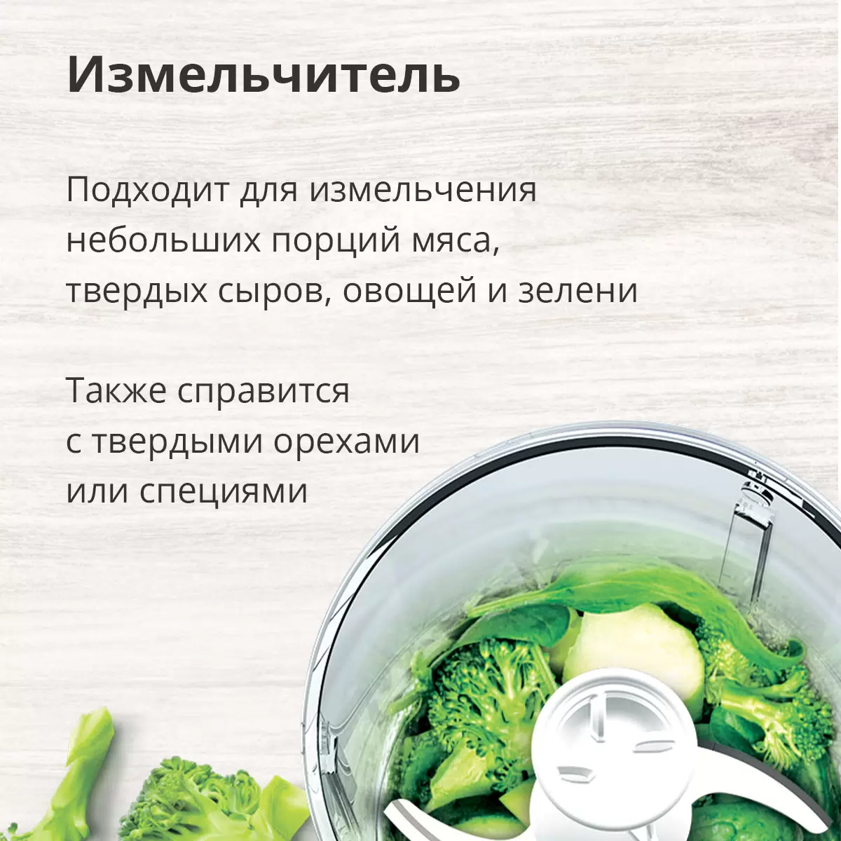 - Насадки в комплектеизмельчитель; насадка-блендер; насадка-миксер