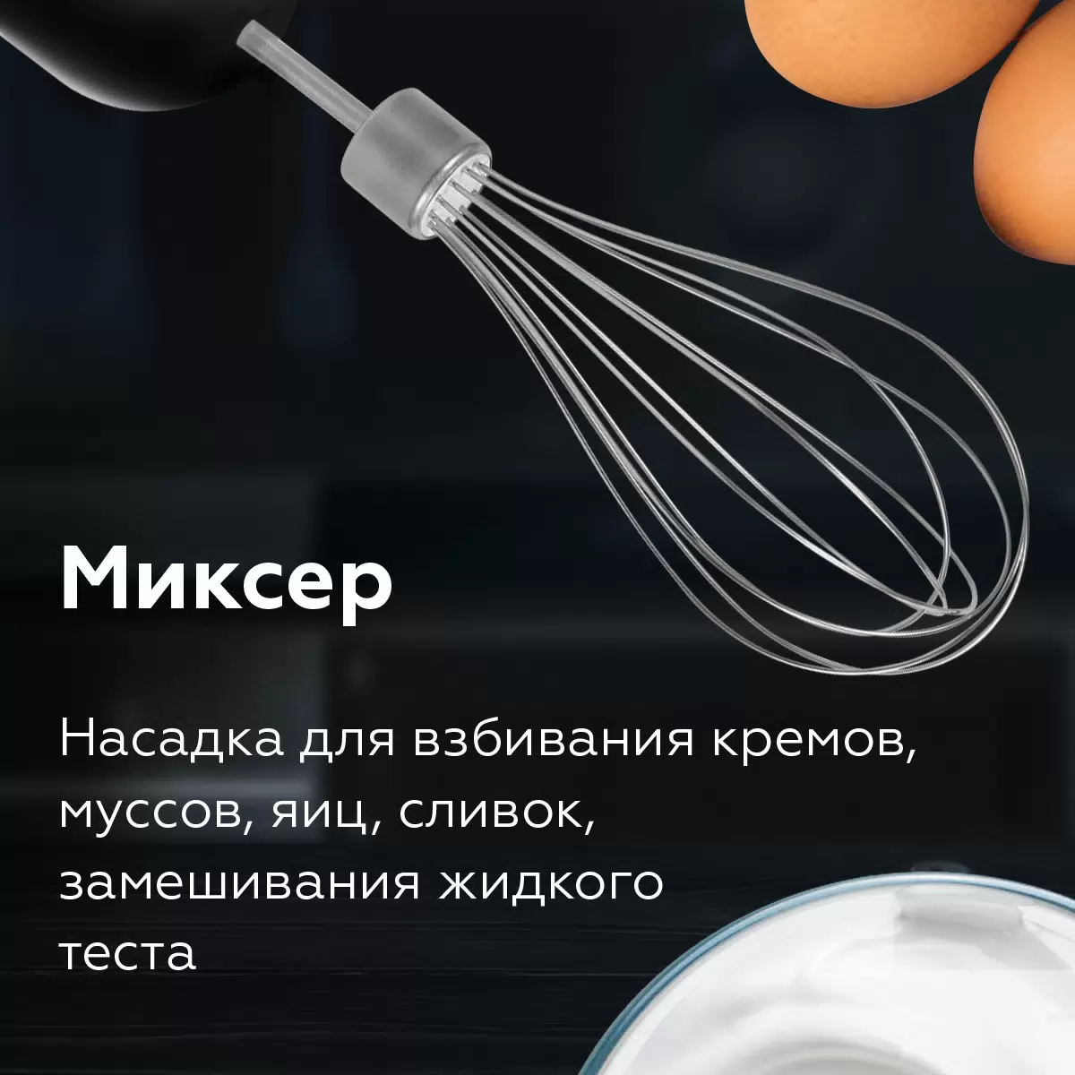 - Насадки в комплектеизмельчитель; насадка-блендер; насадка-миксер