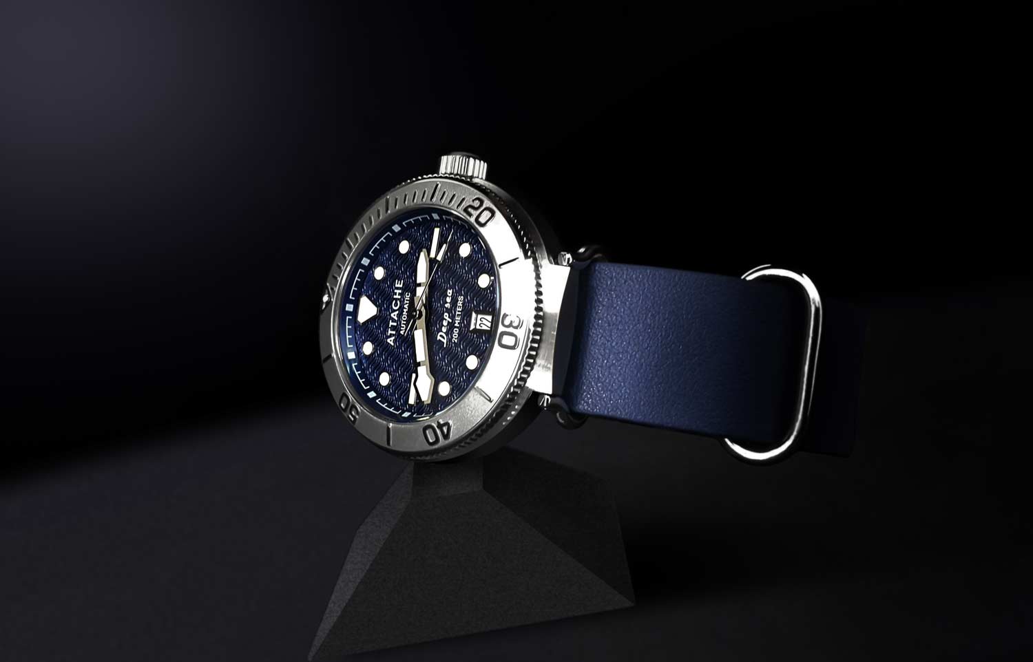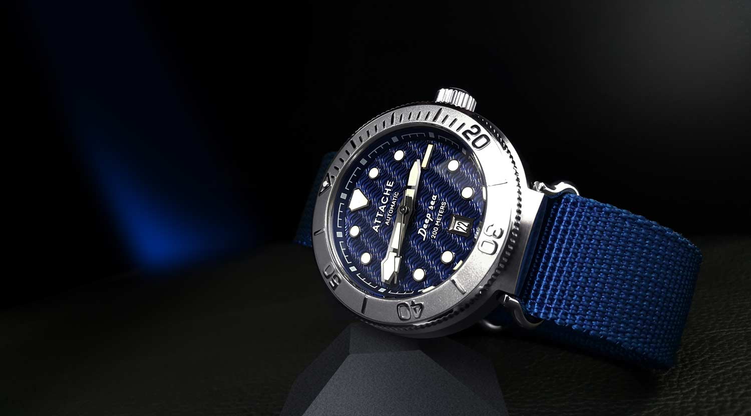 Аксессуар от ATTACHE — это символ высокого качества и престижа, выполненный из лучших материалов и отлично подходящий для активных людей. Лимитированная серия — 100 экземпляров. Мужские автоматические наручные часы. Круглый стальной корпус. Рифленый безель. Циферблат украшен волнообразным рисунком. Метки в виде точек и штрихов. Окошко даты находится в положении 6 часов. Люминесцентное покрытие Super-LumiNova, которое светится в темноте после непродолжительной зарядки на свету. Завинчивающаяся задняя крышка с изображением аквалангиста. Завинчивающаяся рифленая заводная головка. Удобный нейлоновый ремешок с классической застежкой. В комплекте сменный кожаный ремешок.