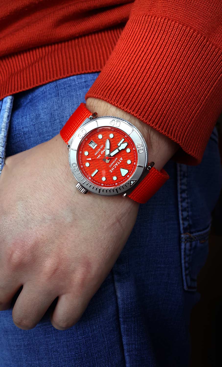 Аксессуар от ATTACHE — это символ высокого качества и престижа, выполненный из лучших материалов и отлично подходящий для активных людей. Лимитированная серия — 100 экземпляров. Мужские автоматические наручные часы. Круглый стальной корпус. Рифленый безель. Циферблат украшен волнообразным рисунком. Метки в виде точек и штрихов. Окошко даты находится в положении 6 часов. Люминесцентное покрытие Super-LumiNova, которое светится в темноте после непродолжительной зарядки на свету. Завинчивающаяся задняя крышка с изображением аквалангиста. Завинчивающаяся рифленая заводная головка. Удобный нейлоновый ремешок с классической застежкой. В комплекте сменный кожаный ремешок.