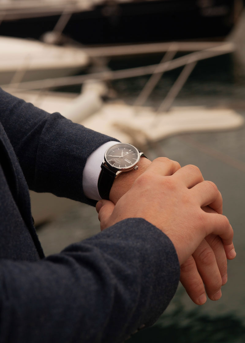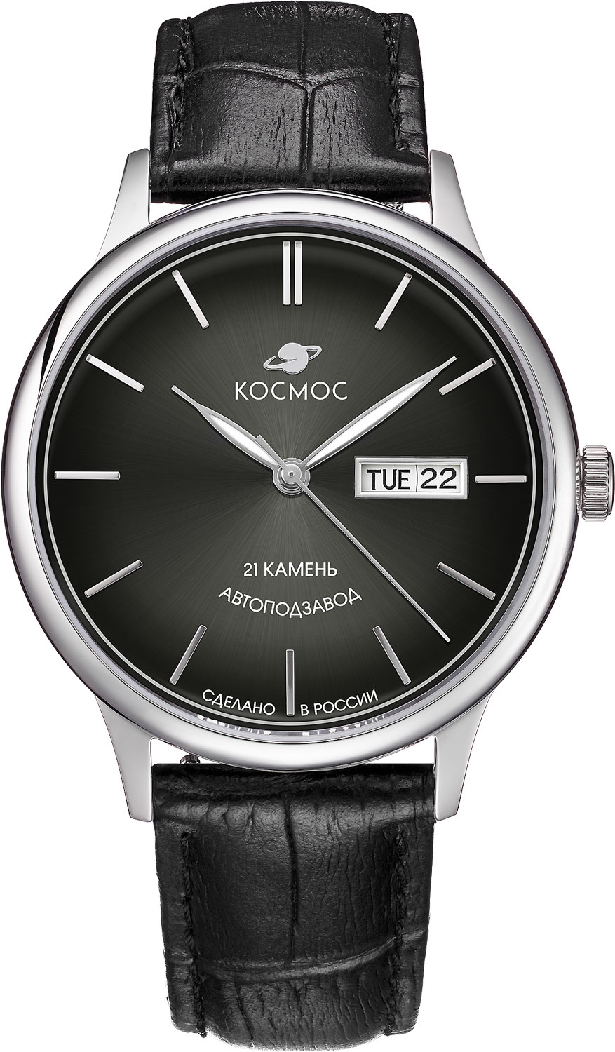 Мужские наручные часы. В механизме 24 камня. Круглый стальной корпус. Циферблат выполнен по технологии Sunray (солнечные лучи). Метки в виде штрихов. Окошко даты и дня недели находится в положении 3 часа. Рифленая заводная головка украшена фирменным логотипом. Завинчивающаяся прозрачная задняя крышка. Ремешок из натуральной кожи с классической застежкой.