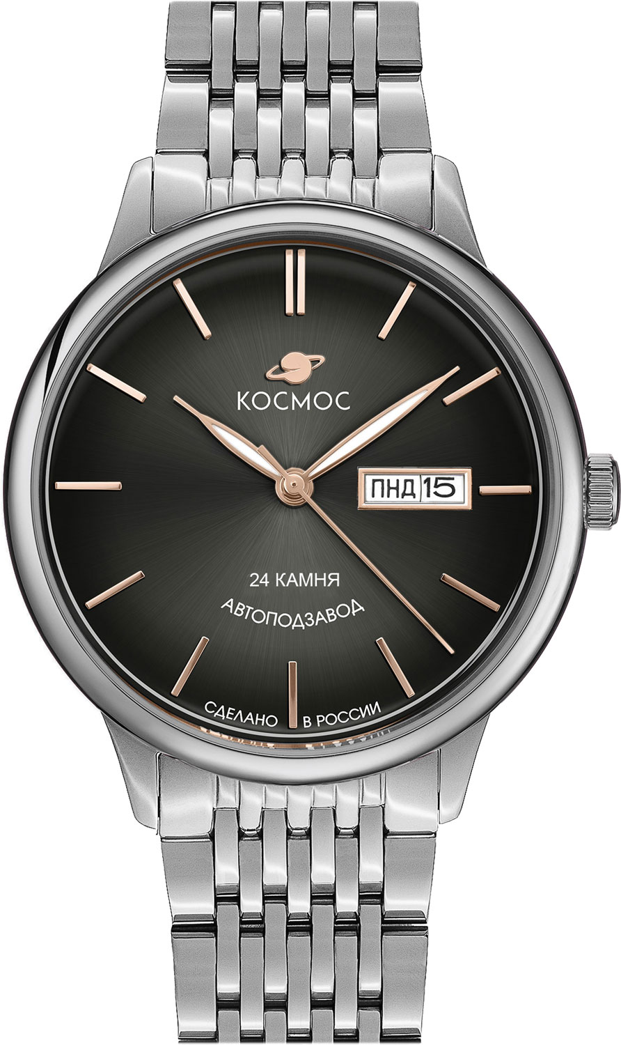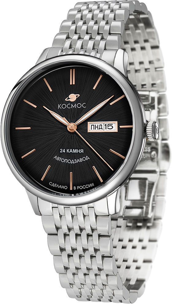 Мужские наручные часы. В механизме 24 камня. Круглый стальной корпус. Циферблат выполнен по технологии Sunray (солнечные лучи). Метки в виде штрихов. Окошко даты и дня недели находится в положении 3 часа. Для индикации дня недели используется два языка: русский и английский.