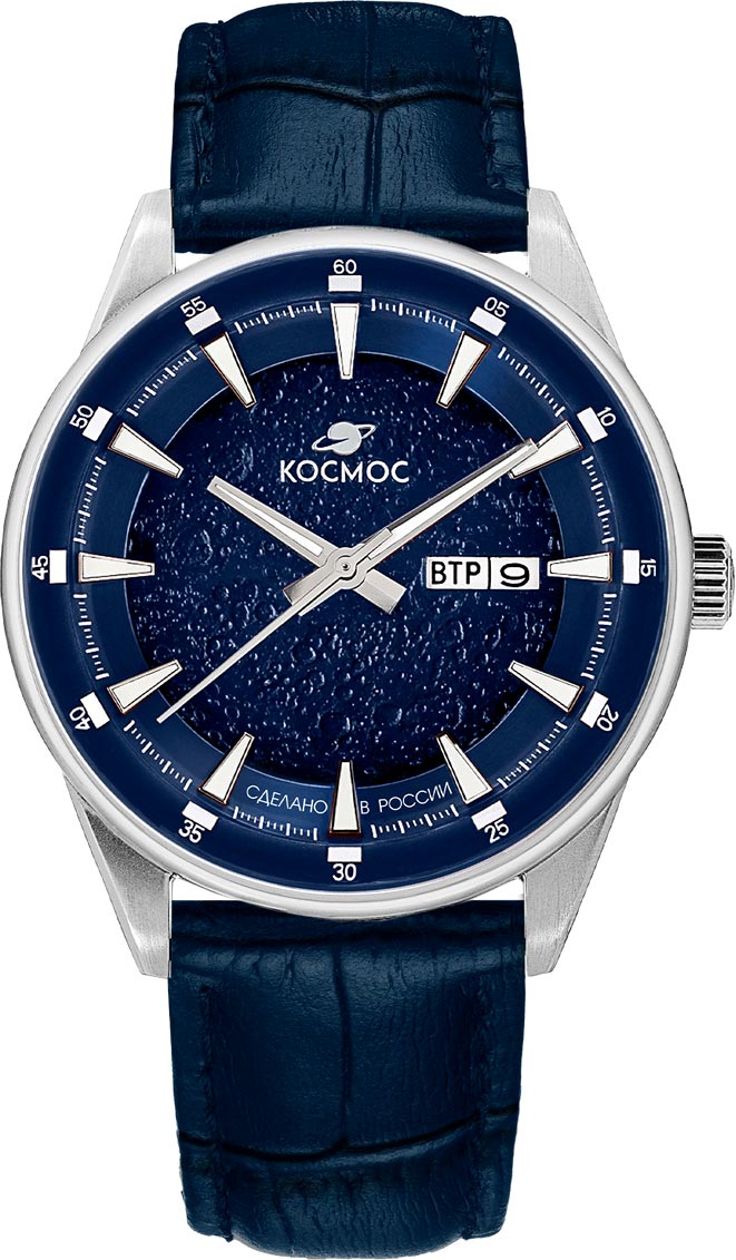 Сдвоенное окошко даты и дня недели находится в положении 3 часа, (текущий день недели может демонстрироваться на двух языках, русском и английском). Циферблат защищен двусторонним выпуклым сапфировым стеклом. Рифленая заводная головка украшена фирменным логотипом.
