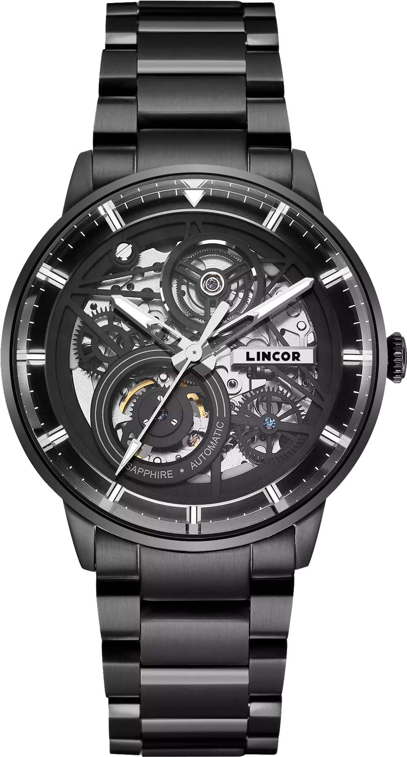 Скелетонизированные мужские механические часы с автоподзаводом Lincor UNI. Круглый стальной корпус с черным IP покрытием. Сквозь прозрачное окошко на циферблате можно наблюдать за работой механизма часов. Метки в виде штрихов. Сапфировое стекло. В механизме 21 камень,частота 21600 полуколебаний в час. Запас хода 42 часа. Возможность ручного завода. Рифленая заводная головка. Надежный стальной браслет с черным IP