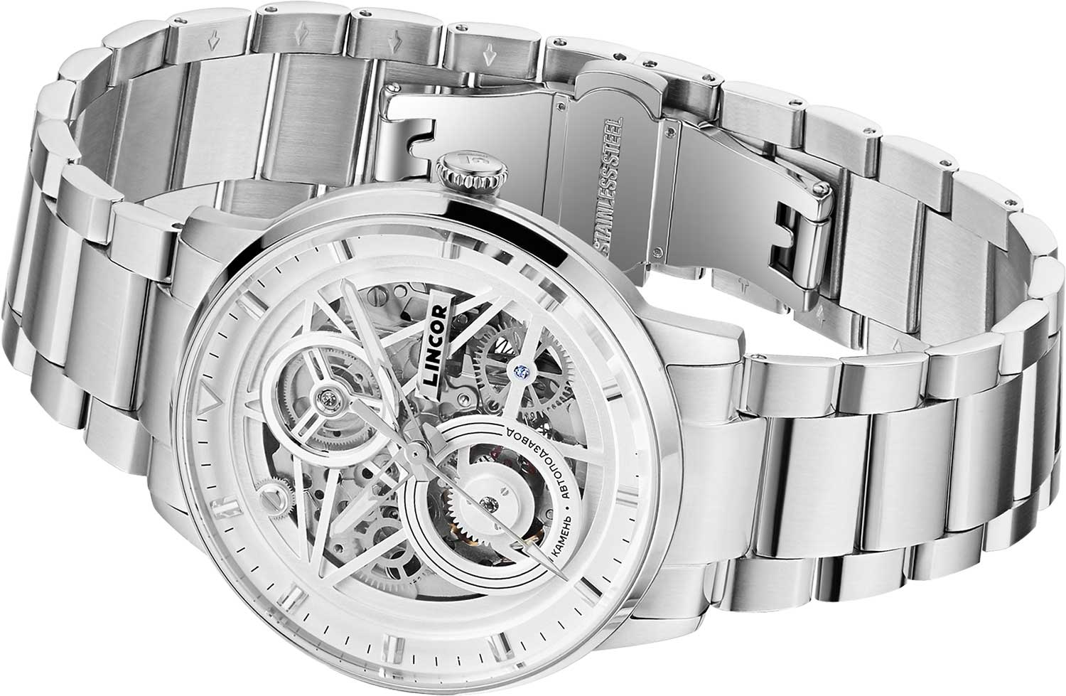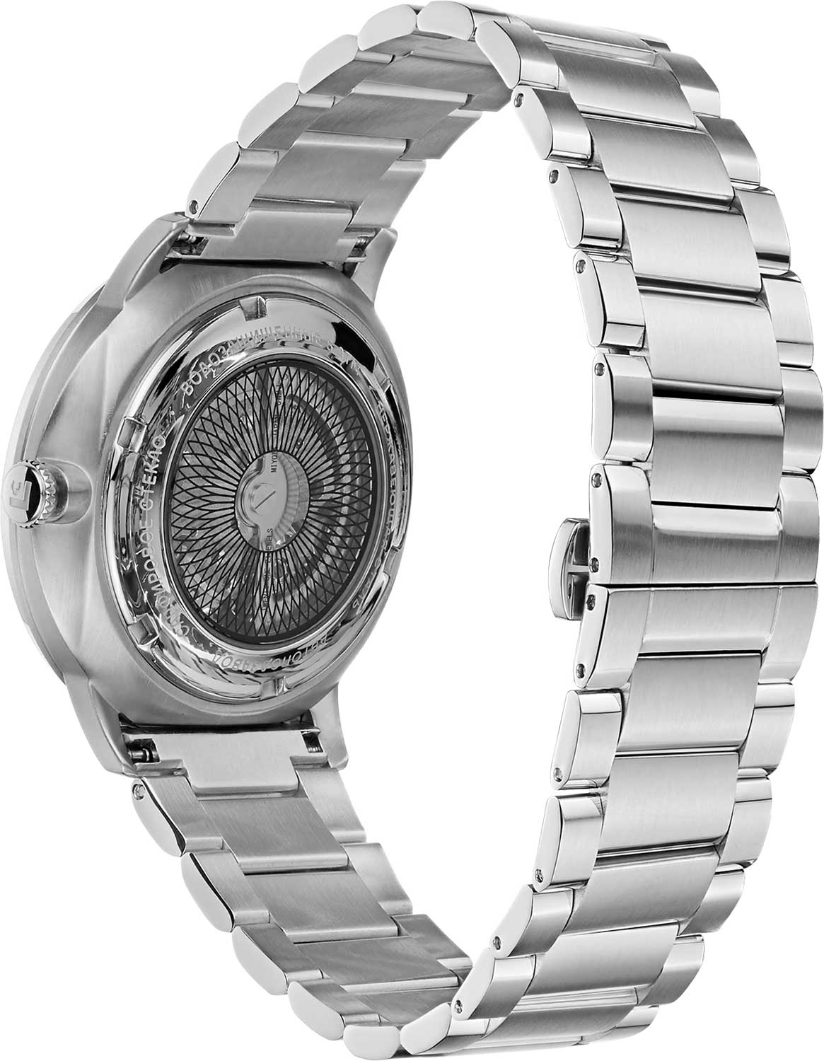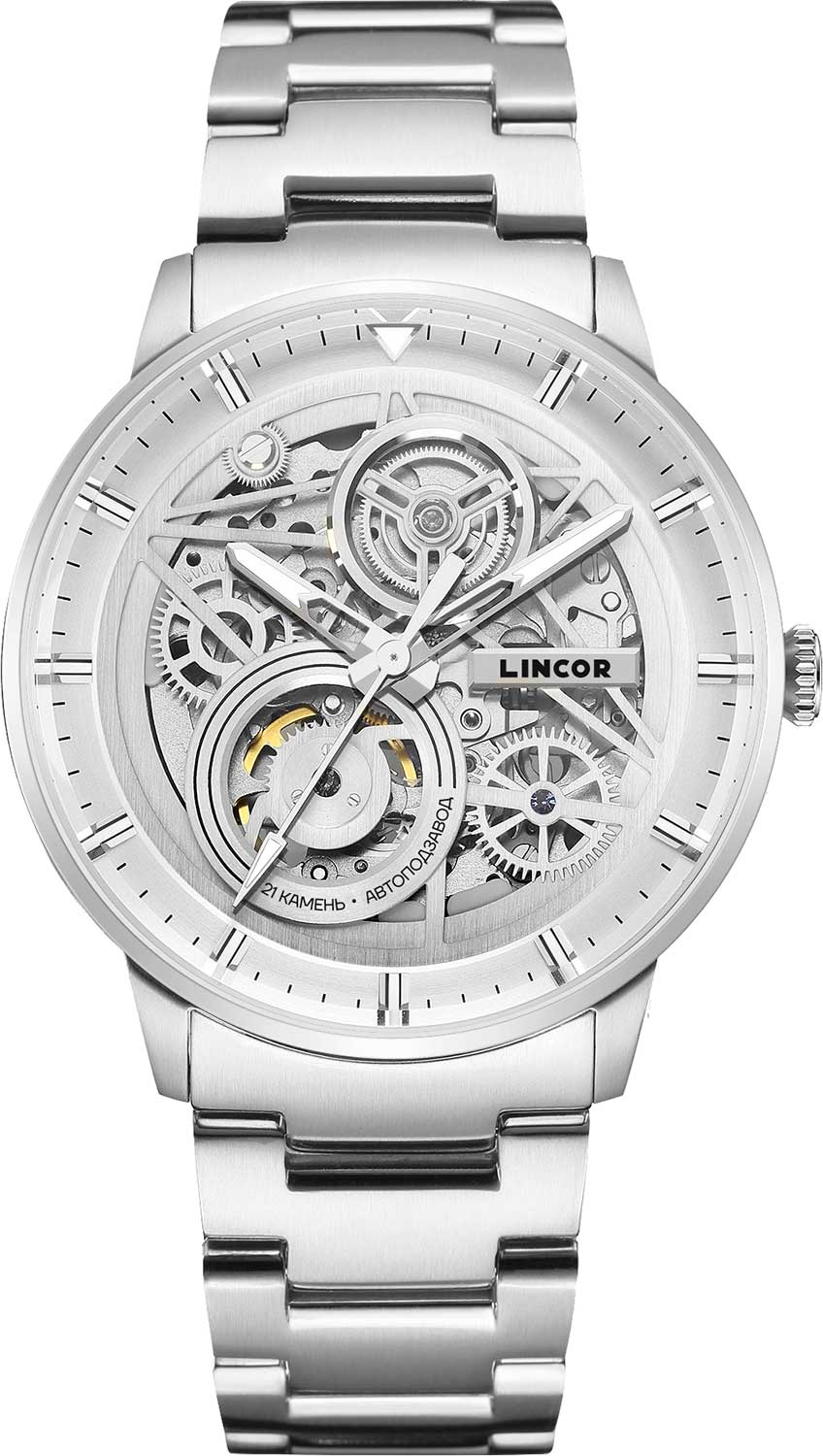 Скелетонизированные мужские часы. В механизме 21 камень, частота 21600 полуколебаний в час. Запас хода 42 часа. Возможность ручного завода. Циферблат с метками в виде штрихов защищен прочным сапфировым стеклом. Стрелки и метки с люминесцентным покрытием, которое светится в темноте после непродолжительной зарядки на свету. Рифленая заводная головка. Прозрачная задняя крышка. Браслет с раскладывающейся застежкой.