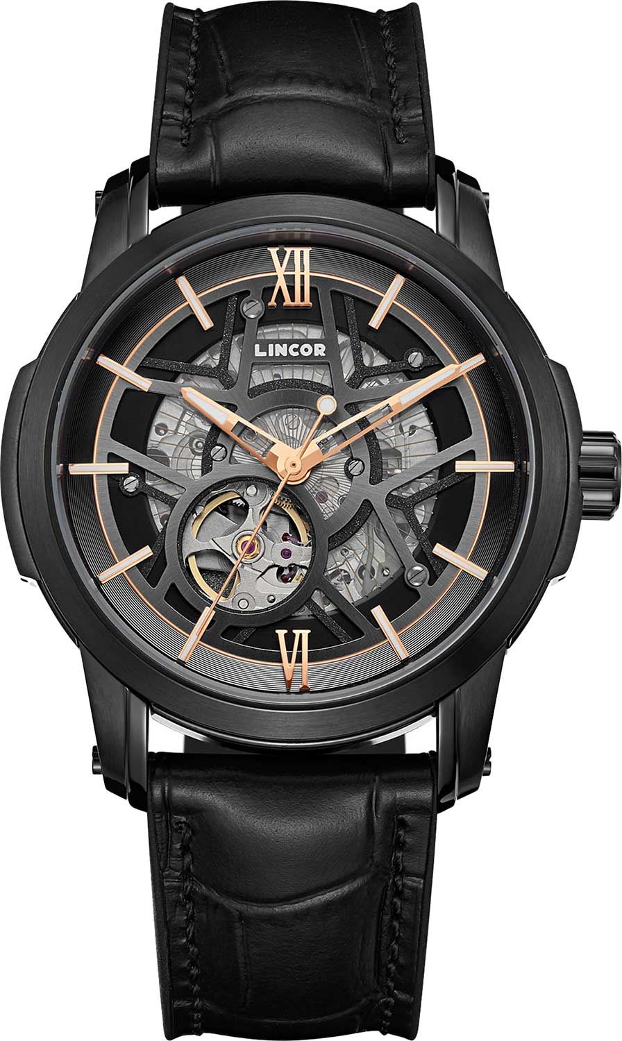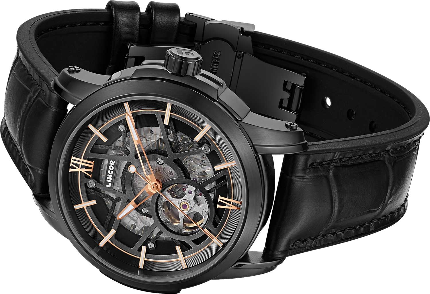 Скелетонизированные мужские часы. В механизме 21 камень,частота 21600 полуколебаний в час. Запас хода 35 часов. Возможность ручного завода. Циферблат защищен прочным сапфировым стеклом. Метки в виде штрихов и двух римских цифр. Стрелки и метки с люминесцентным покрытием, которое светится в темноте после непродолжительной зарядки на свету. Рифленая заводная головка. Прозрачная задняя крышка крепится на 4-х винтах. Ремешок с раскладывающейся застежкой и системой быстрой замены.