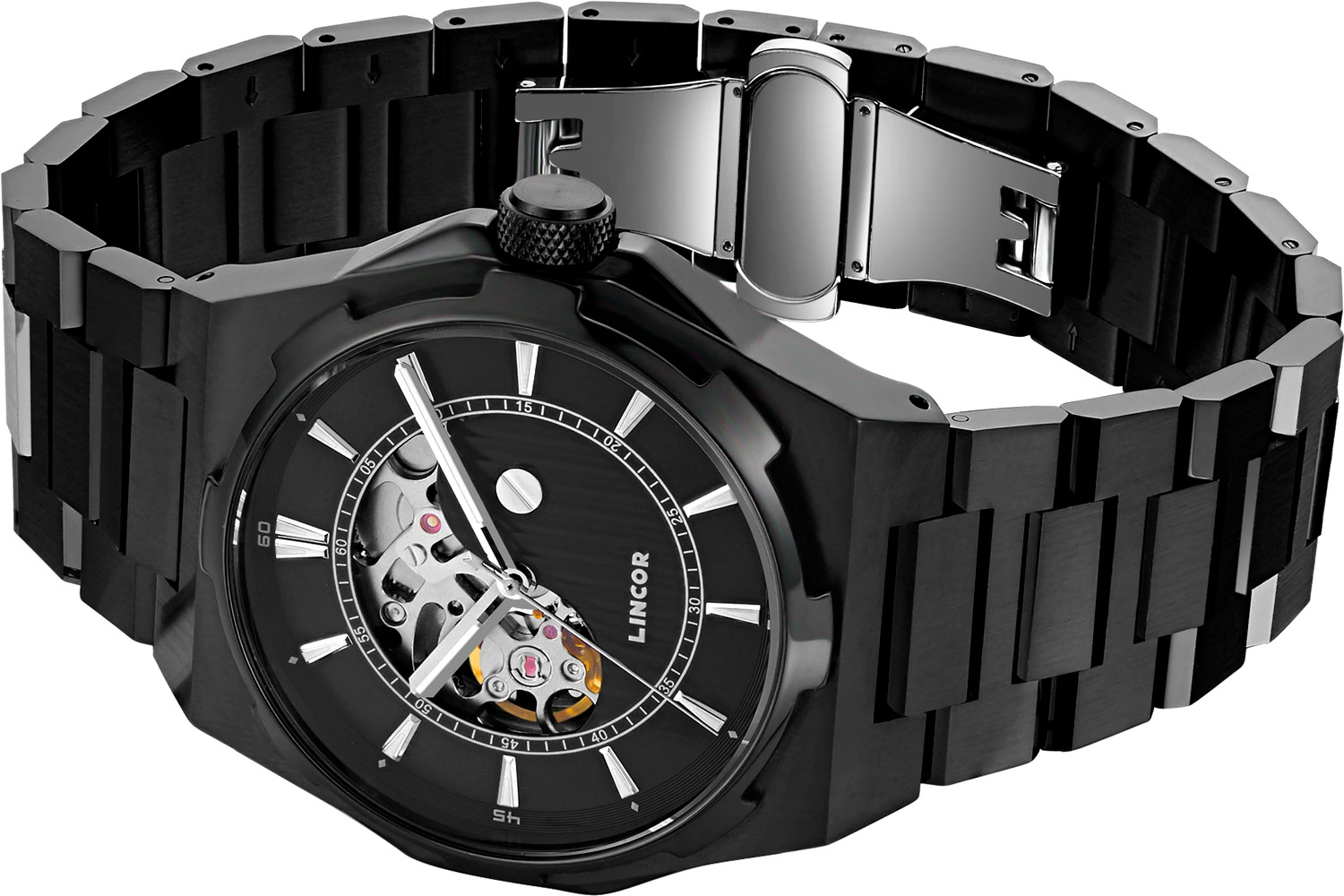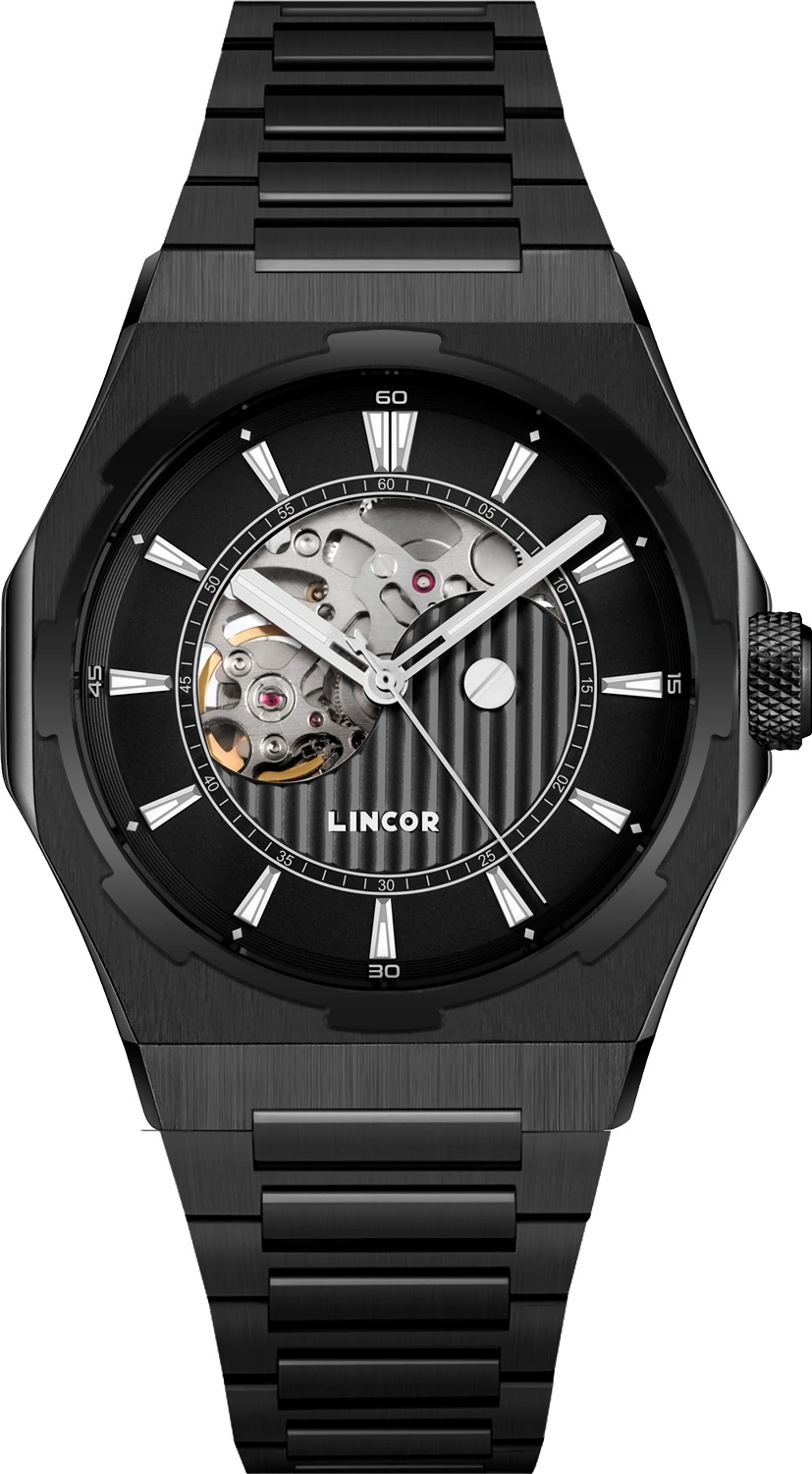 Оригинальные и стильные часы – это больше, чем просто аксессуар, это знак уважения к времени, точности и традициям.Скелетонизированные мужские механические часы с автоподзаводом Lincor UNI. Стальной корпус необычной восьмиугольной формы с черным IP покрытием. Циферблат с метками в виде штрихов защищен прочным сапфировым стеклом. В механизме 24 камня,частота 21600 полуколебаний в час. Запас хода 41 час. Двунаправленный автоподзавод. Функция остановки секундной стрелки. Заводная головка с защитой. На задней крышке имеется прозрачное окошко, через которое можно наблюдать работу механизма часов. Надежный стальной браслет с черным IP