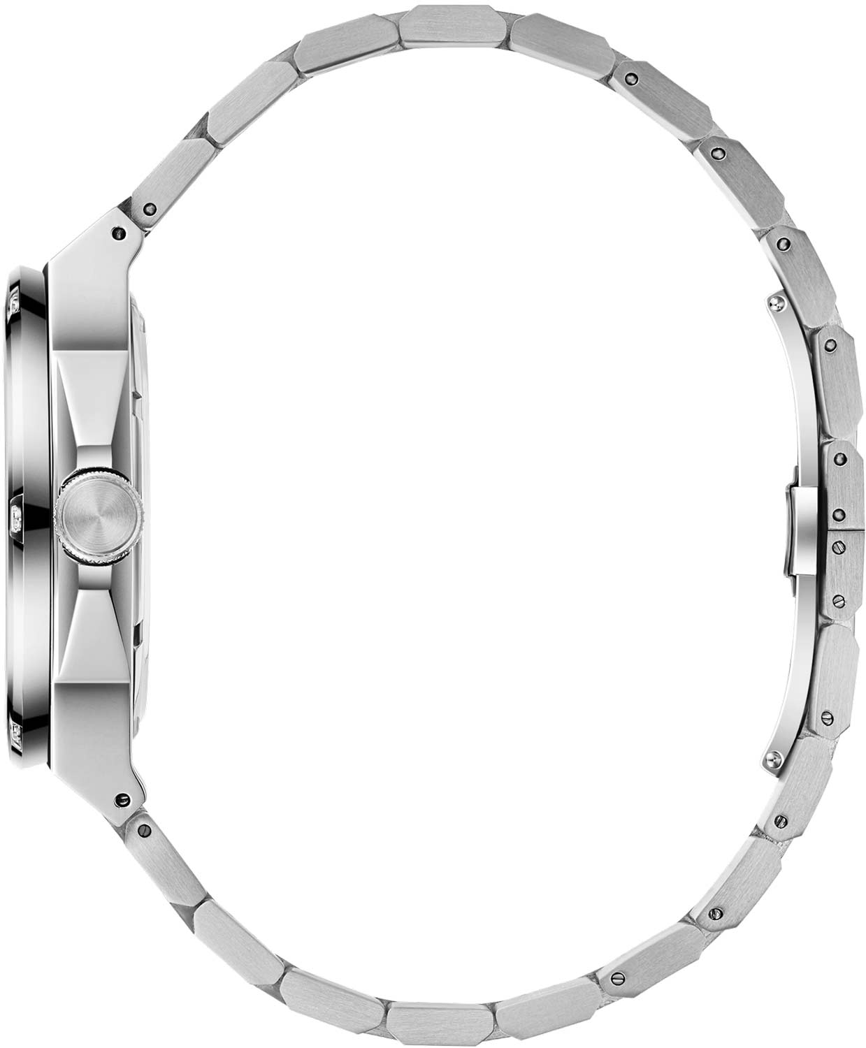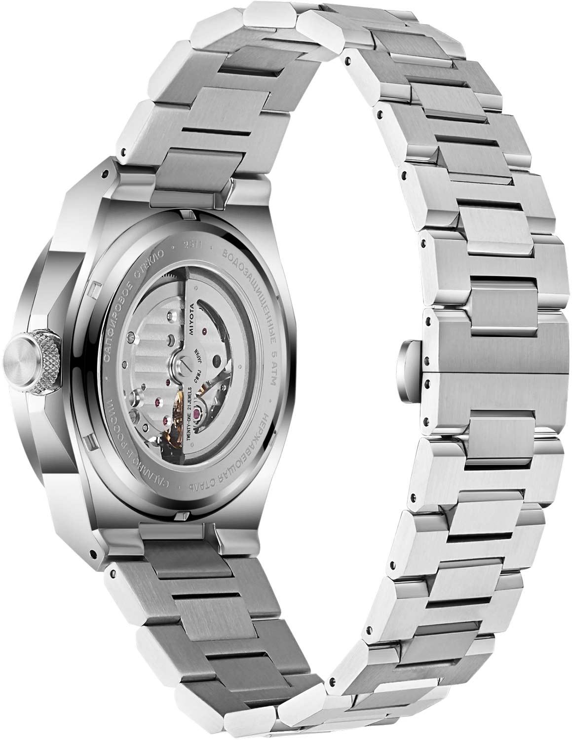 Рифленая заводная головка. Завинчивающаяся прозрачная задняя крышка. Браслет с раскладывающейся застежкой.