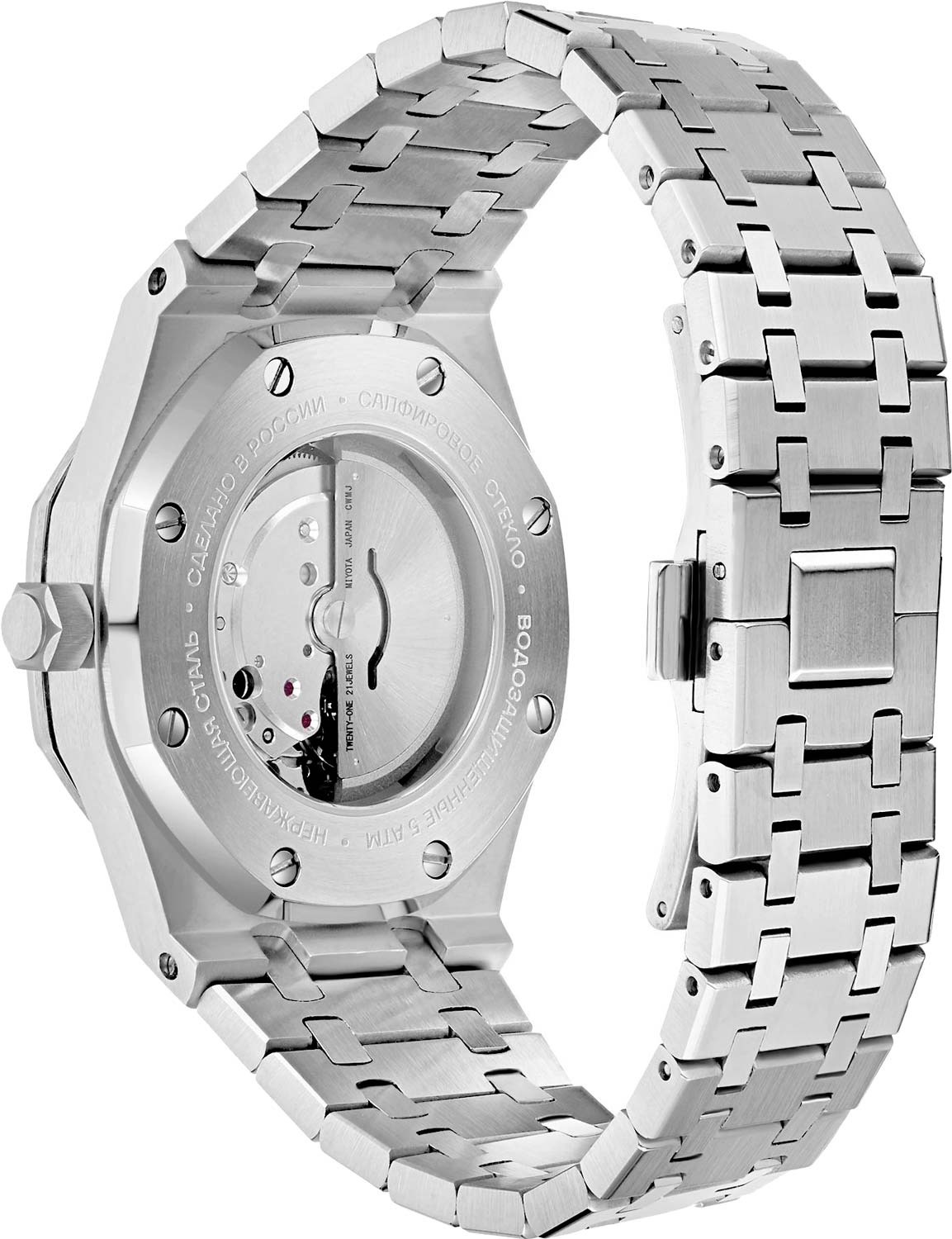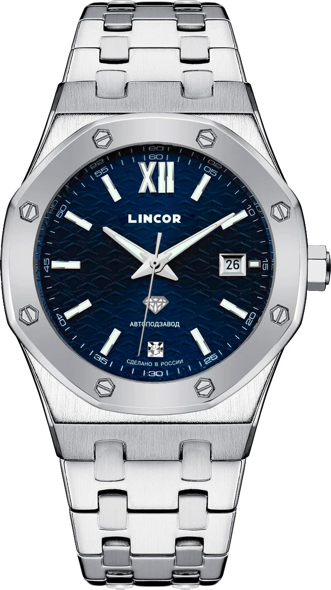 Эти уникальные часы — стильный аксессуар, который подчеркнет образ успешного и уверенного в себе мужчины. Мужские механические часы с автоподзаводом Lincor UNI. В механизме 21 камень, частота 21600 полуколебаний в час. Запас хода 42 часа. Возможность ручного завода. Оригинальный безель с имитацией винтовых креплений. Рельефный циферблат защищен прочным сапфировым стеклом. По краю циферблата нанесена минутная шкала. Метки в виде штрихов, римской цифры XII и кристалла в положении 6 часов. Клиновидные стрелки в стиле Dauphine. Стрелки и метки с люминесцентным покрытием, которое светится в темноте после непродолжительной зарядки на свету. Окошко даты находится в положении 3 часа. Граненая заводная головка. На задней крышке имеется прозрачное окошко, через которое можно наблюдать работу механизма часов. Надежный стальной браслет с удобной застежкой-бабочкой.